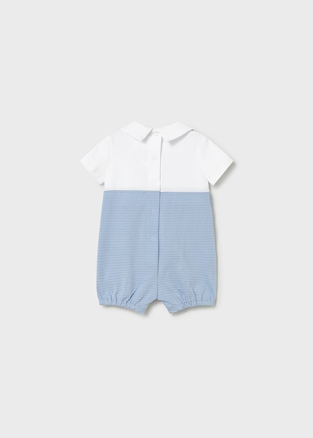 A classic and elegant newborn boy romper by Mayoral, designed for comfort and timeless style. This short romper features a soft white short-sleeve top with a smart collar, paired with a textured light blue lower section and cute embroidered dog detail. Made from gentle cotton blends, it offers breathability, flexibility, and a comfortable fit for everyday wear or special occasions.