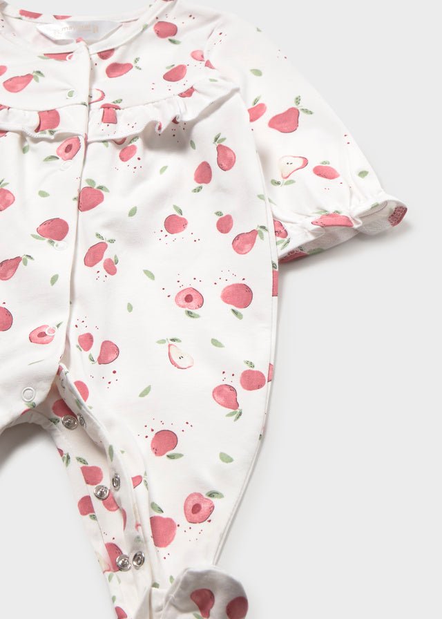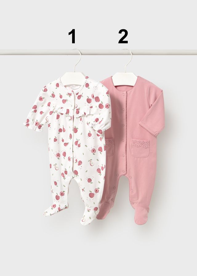 Sweet and comfortable Mayoral newborn girl babygrow pyjamas designed for cosy sleep and everyday comfort. Available in two styles shown in images 1 and 2, each babygrow is sold separately. One features a charming peach fruit print with delicate frill detailing, while the other comes in soft pink with decorative pockets and classic styling. Made from soft stretch cotton, these babygrows are gentle on delicate newborn skin and perfect for day or night wear.