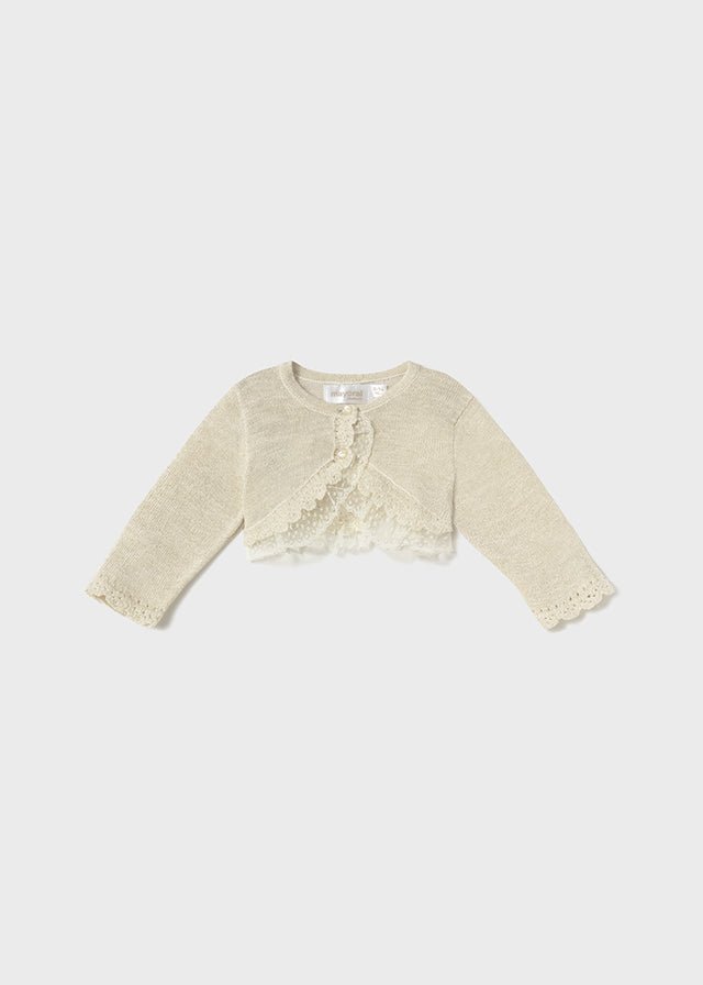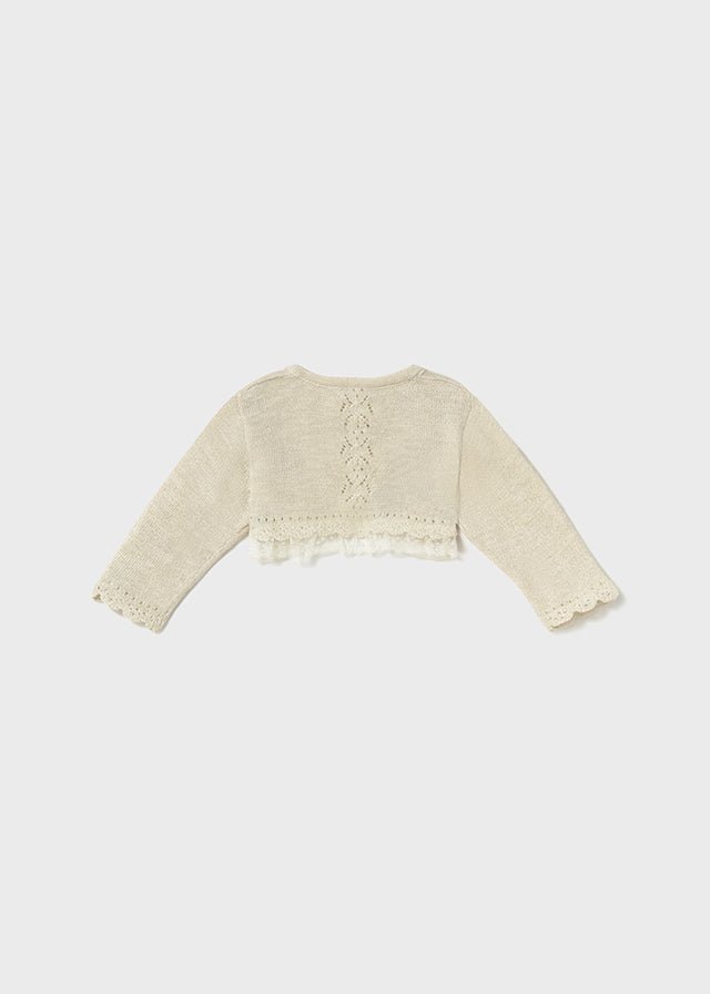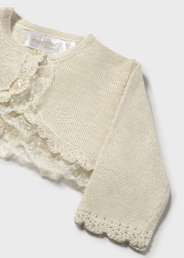 This Mayoral newborn girl knitted bolero in beige is a timeless and elegant piece for special occasions. Featuring lace trim and scalloped edges, it provides a refined finish while keeping your little one cosy. The neutral beige shade makes it an easy match for christening gowns, dresses, and formal outfits.