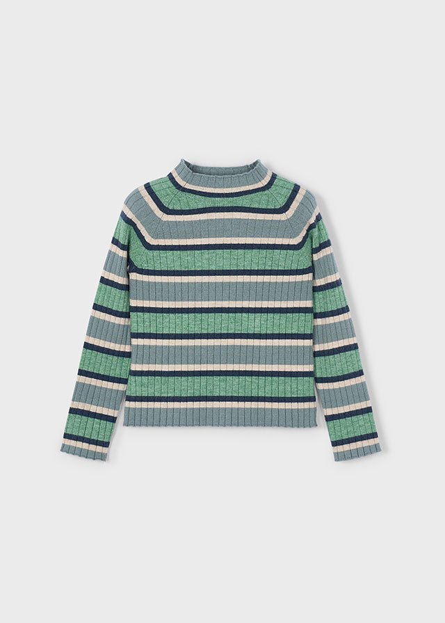 A soft and cosy Mayoral girls’ rib turtleneck designed with stretchy ribbed fabric for a comfortable fit. The striped pattern in green, grey, navy, and cream adds a stylish seasonal look, perfect for layering during autumn and winter.