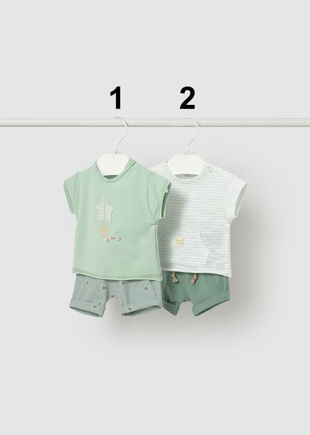 A soft and comfortable newborn boy two-piece summer set, perfect for everyday wear and warm-weather outings. This Mayoral set includes a short sleeve t-shirt with delicate embroidery detailing and matching shorts featuring a subtle star pattern. Designed with gentle fabrics and an easy fit to keep little ones comfortable all day. Each set shown is sold separately.