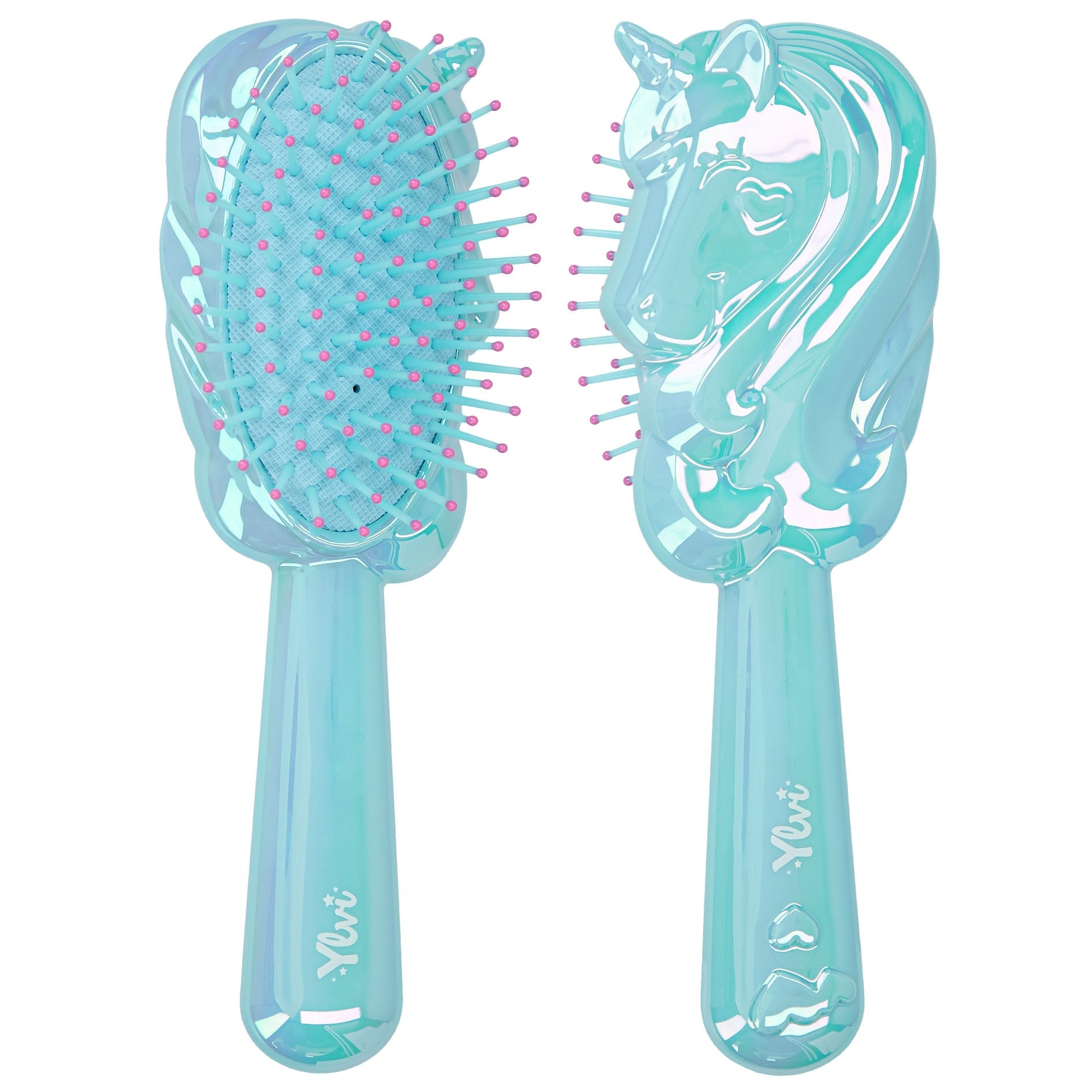 How unicorn fans comb their hair: Ylvi's stick hairbrushes have the cute shape of a unicorn's head with a dreamy mane. With cute hearts on the handle and on the unicorn's cheek. All in a shimmering mother-of-pearl look in pink or blue.