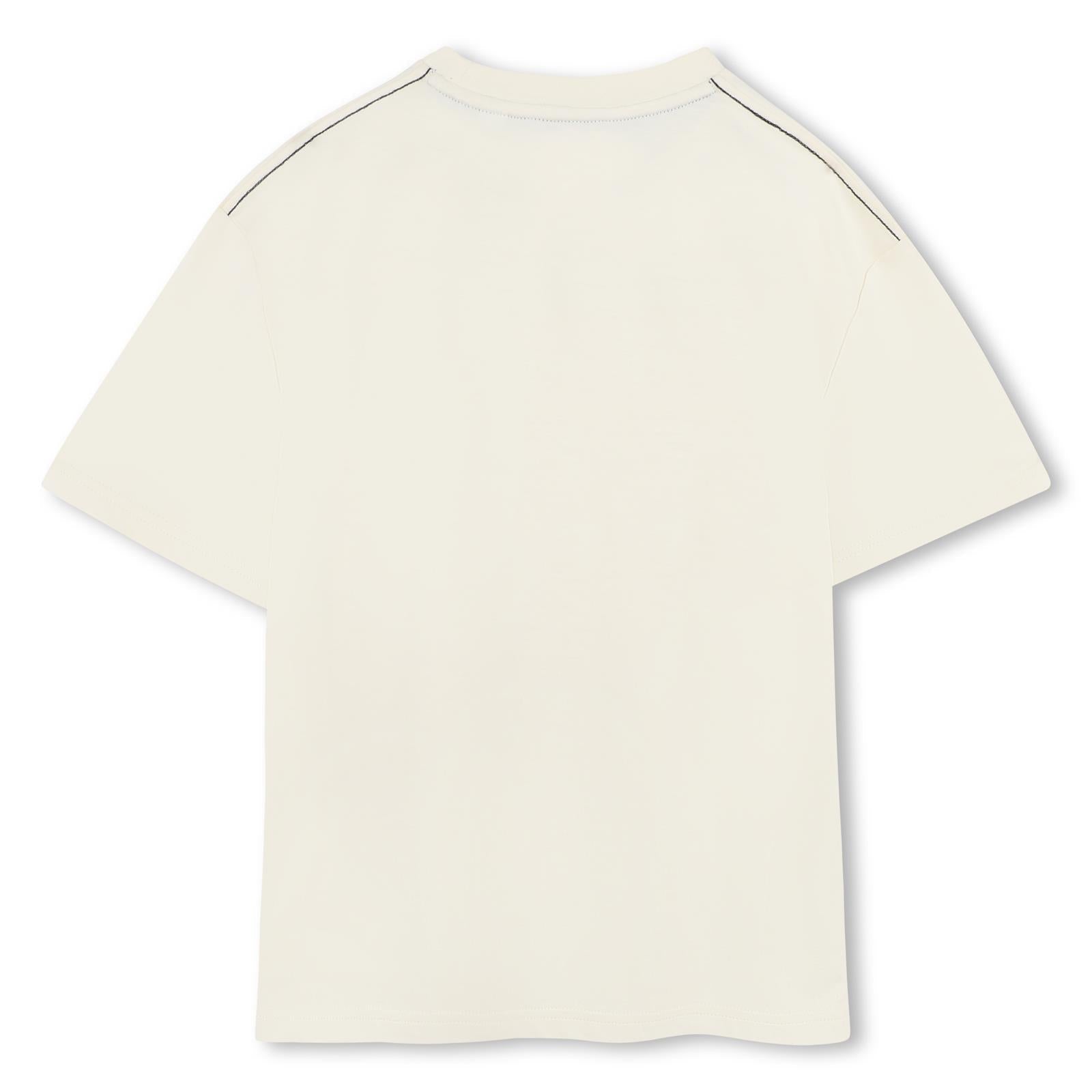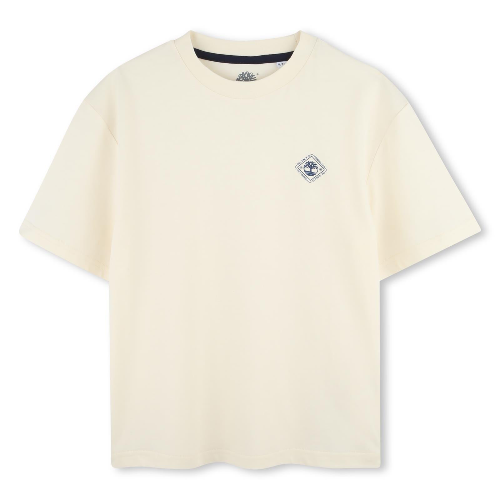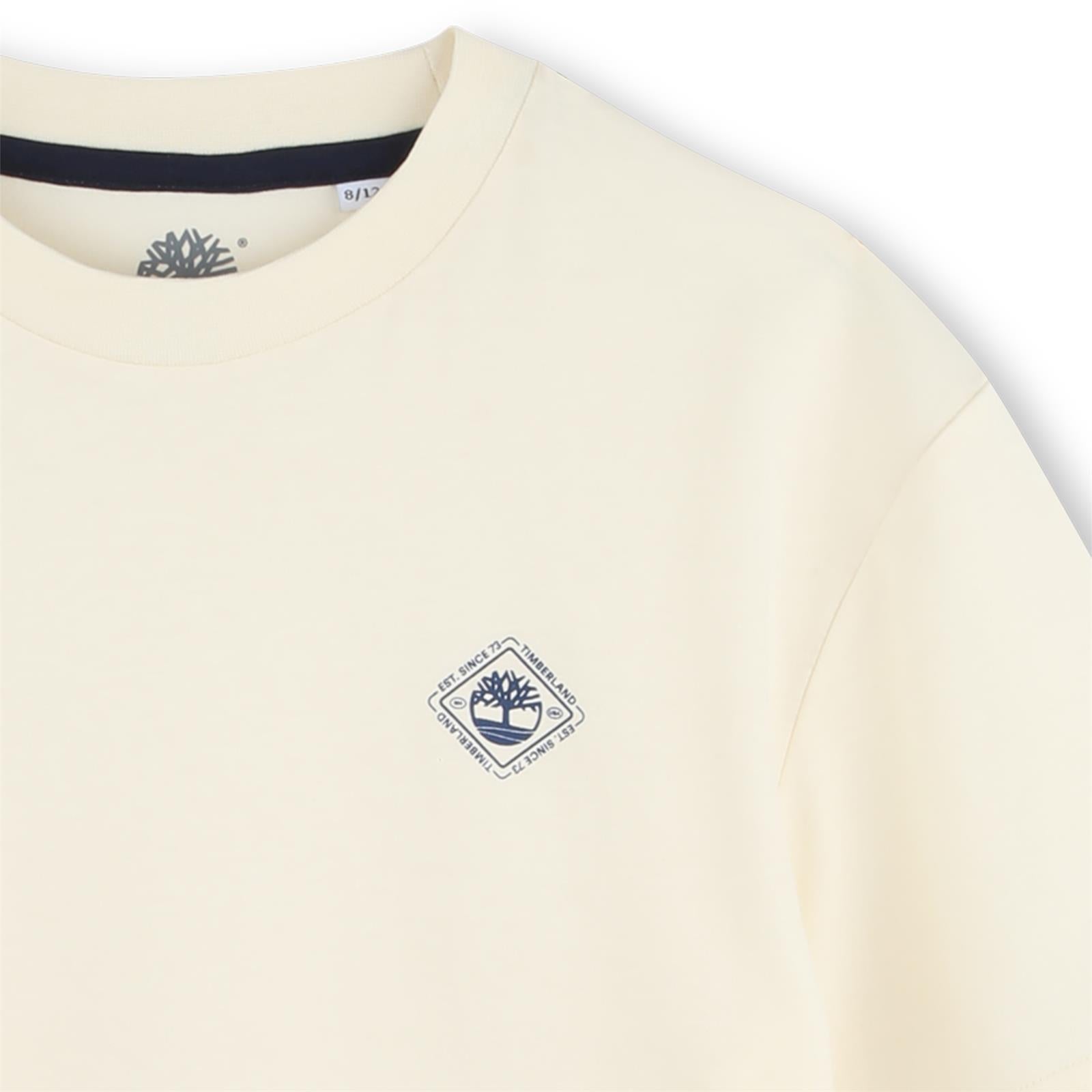 Soft ivory short-sleeved T-shirt for boys by Timberland, made from organic cotton jersey. It features the brand's signature navy blue tree logo printed on the chest. Designed in a relaxed fit, this tee is perfect for everyday wear.