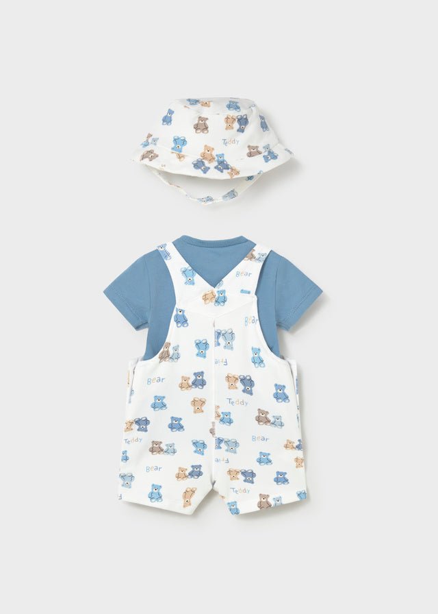 Adorable Mayoral newborn boy three-piece outfit featuring teddy bear printed dungaree-style short romper, coordinating short sleeve t-shirt, and matching hat. Designed in soft blue tones with playful teddy bear motifs, this charming set combines comfort with cute everyday style. Crafted from soft stretch cotton blends, it ensures gentle comfort for delicate newborn skin, perfect for warm-weather outfits or gifting.