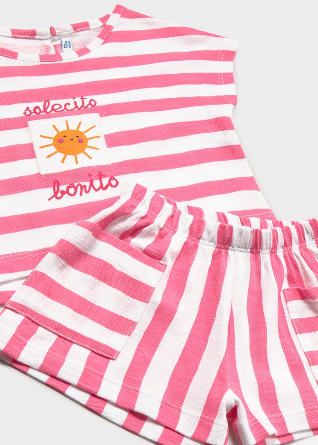 This baby girl short set by Mayoral is a fresh and comfortable summer outfit, perfect for warm days. The short-sleeve t-shirt features pink and white stripes with a sweet sun motif and “solecito bonito” embroidery on the front. Paired with matching striped shorts, this set is ideal for everyday wear, holidays, and playtime.