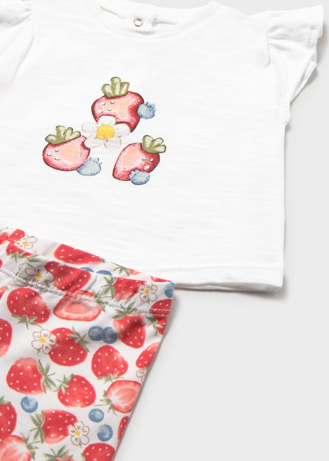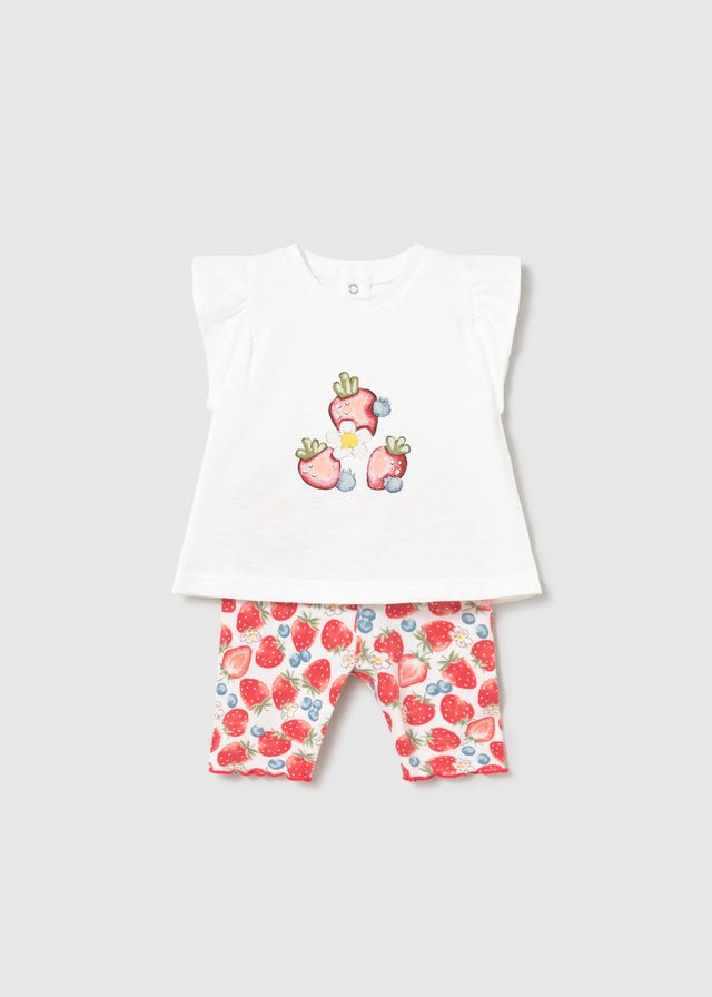 This sweet Mayoral newborn girl leggings set features a soft short-sleeve t-shirt with an adorable strawberry motif, paired with coordinating printed leggings. Designed for everyday comfort, this lightweight outfit is perfect for warm days, playtime, or casual outings.