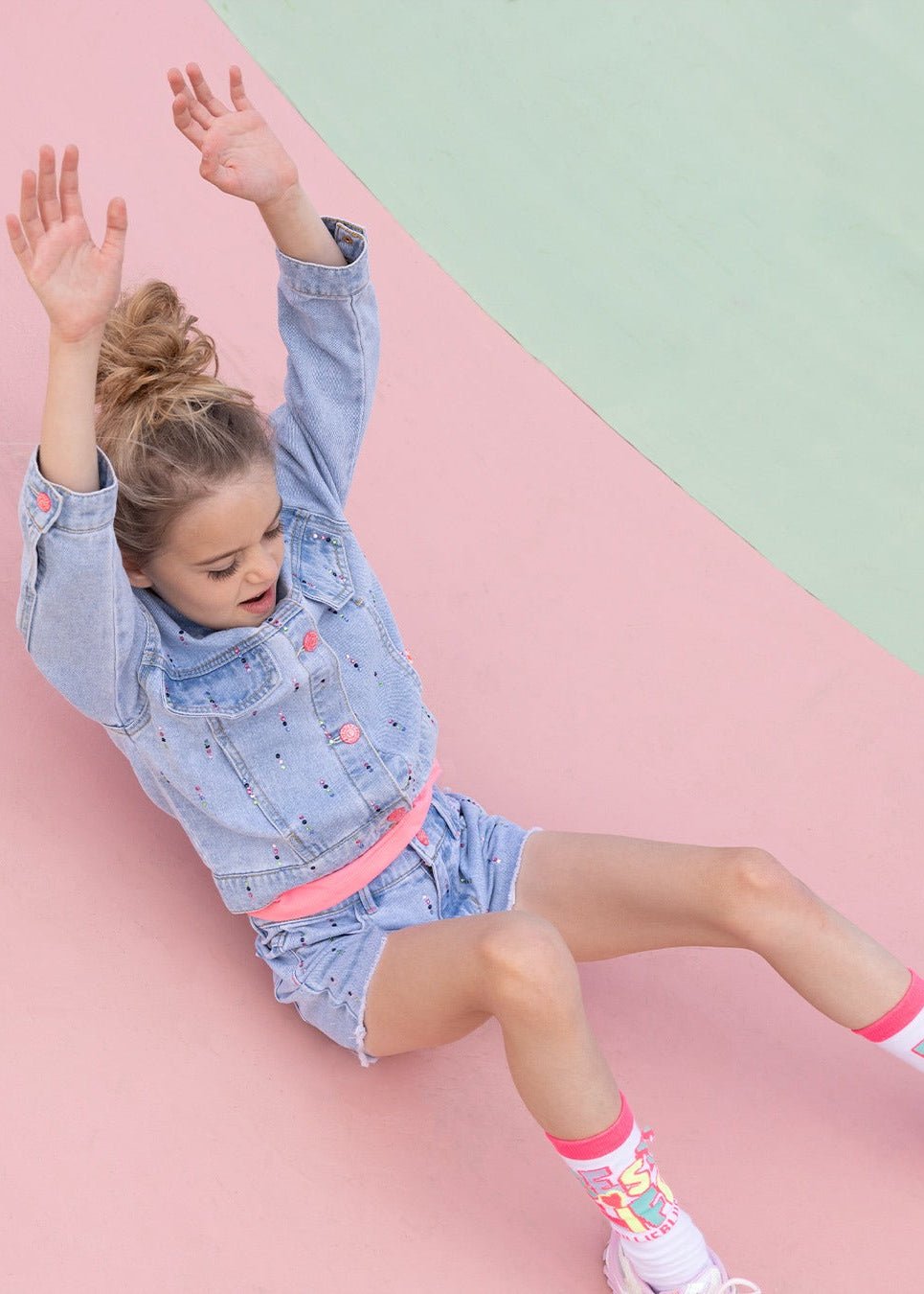 • Light blue denim with multicolour studs