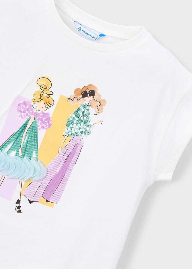 A stylish girls short sleeve t-shirt featuring a modern illustrated fashion girls print with textured and sequin-style detailing. Designed with softly structured sleeves and a comfortable stretch fit, this t-shirt adds a playful yet trendy touch to everyday outfits. Made by Mayoral, it’s ideal for pairing with jeans, shorts, or skirts for a fresh summer look.