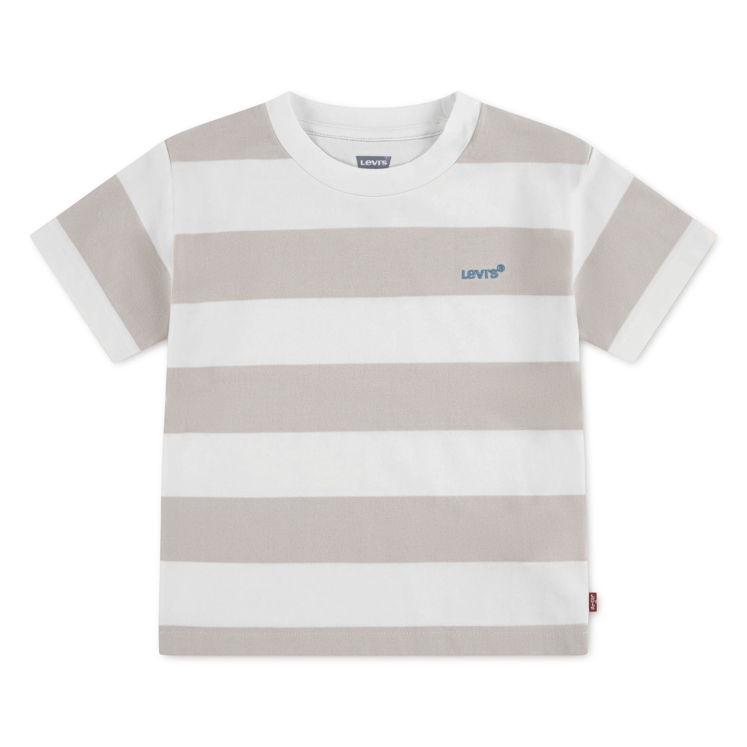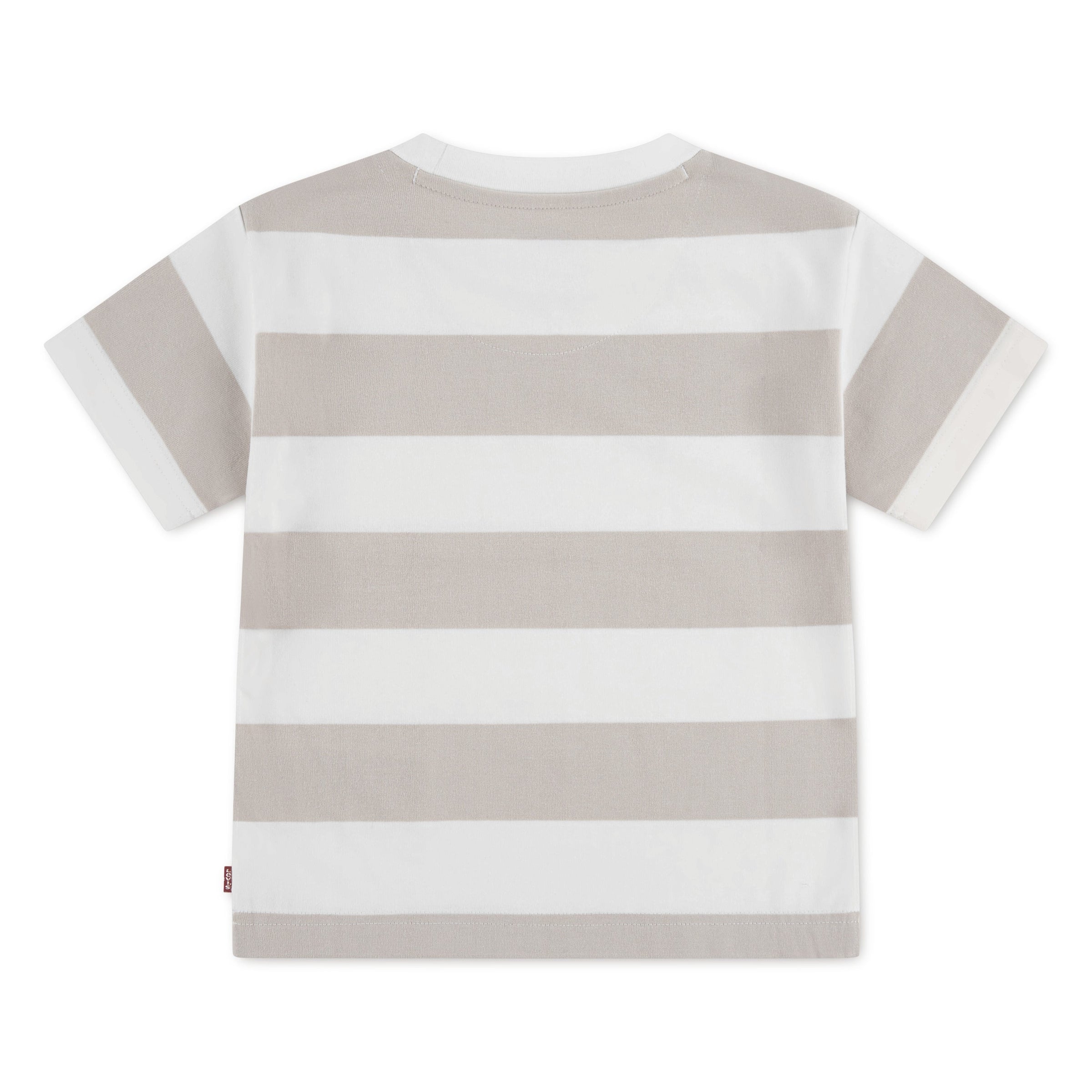 Levi’s boys short sleeve t-shirt featuring bold wide stripe design and a subtle embroidered Levi’s logo on the chest. Designed in neutral beige and white stripes, this modern casual tee is made from a soft cotton blend jersey, perfect for everyday outfits and easy styling.