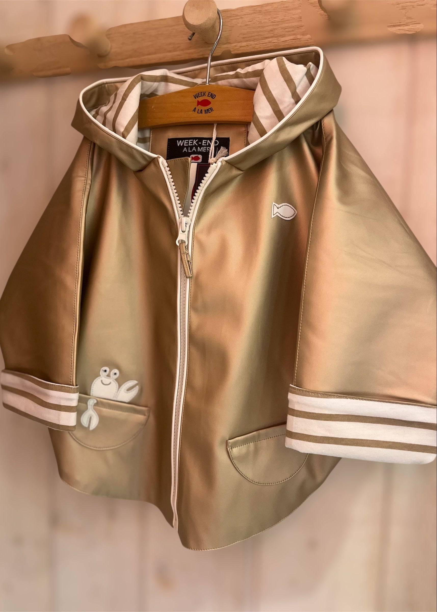This Week-end à la Mer baby hooded rain cape is a practical and stylish choice for baby girls aged 6–24 months. Designed to be waterproof and wind resistant, it features a soft cotton jersey lining with the brand’s signature gold and white Breton stripes and playful red fish print. Finished with charming nautical details, this rain cape is ideal for everyday wear in wet and windy weather.
