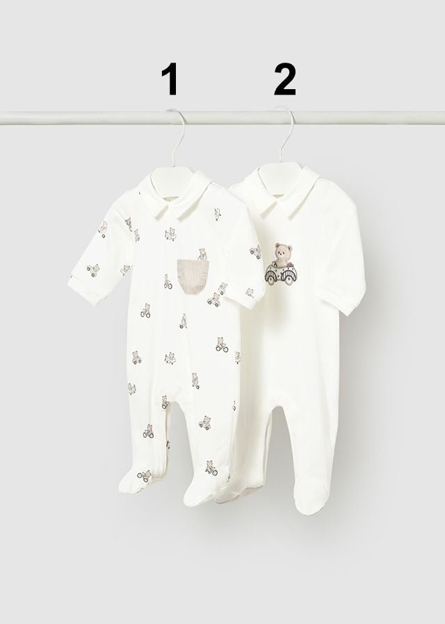 Newborn boy pyjamas by Mayoral, designed for comfort and gentle everyday wear. These soft all-in-one styles feature an adorable teddy bear motif, with one option showing an all-over teddy print and the other a central teddy illustration. Finished with a classic collar, footed legs, and practical snap-button fastening for easy changing. Each style is sold separately.