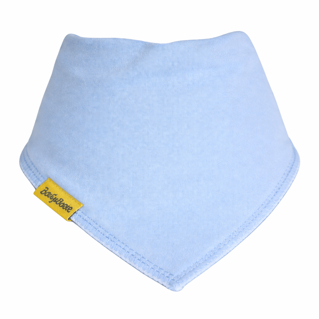 DribbleBoo bandana bib in a soft baby blue shade. A soft and practical baby bib for everyday dribbling, teething, and feeding.