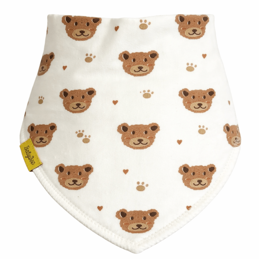 Let your little one snuggle up in style with the Bear Hugs DribbleBoo bandana bib. Featuring sweet teddy bear faces, tiny paw prints, and little hearts on a creamy white background, this charming bib adds a touch of cuteness to everyday outfits. Made from soft organic cotton with a fleece lining, it’s gentle on skin while protecting clothes from dribbles and spills.