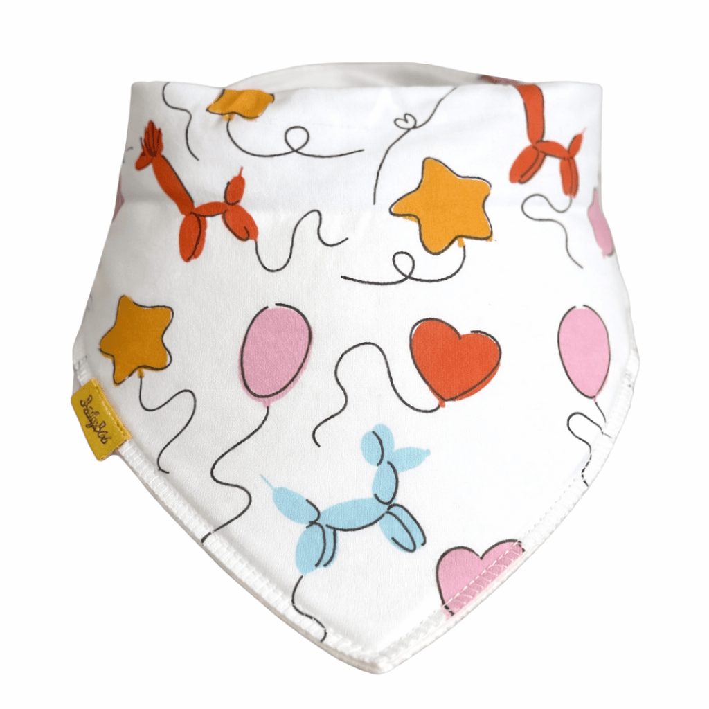 Let your little one join the celebration with the Party Balloons DribbleBoo bandana bib. Decorated with cheerful balloon shapes including hearts, stars, and fun animal twists on a crisp white background, this joyful print is perfect for festive days. Made from soft organic cotton with a fleece lining, it’s gentle on skin while protecting clothes from dribbles and spills.