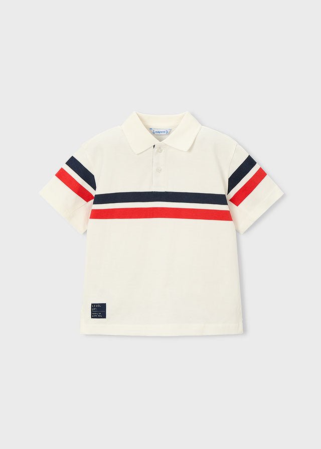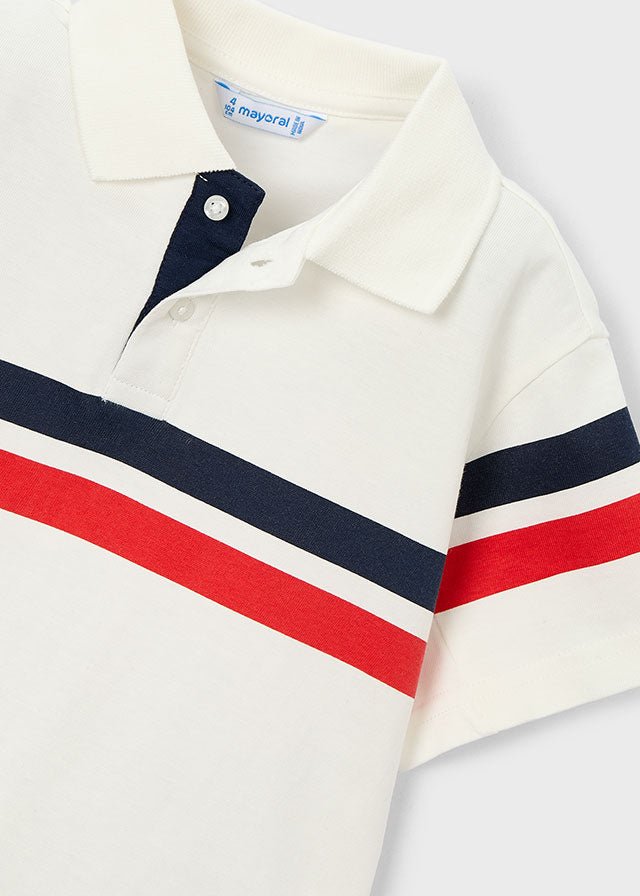 This Mayoral boys short sleeve polo shirt features a clean, sporty striped design across the chest, perfect for smart-casual looks. Made from soft cotton with a touch of stretch, it’s ideal for everyday wear, school outings, or family occasions.