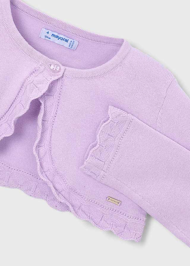 This girl basic knit bolero by Mayoral is a delicate and elegant layering piece, perfect for special occasions or everyday outfits. Designed in a soft lilac shade, it features a cropped silhouette with scalloped edging and a single-button fastening, making it ideal to wear over dresses or tops.