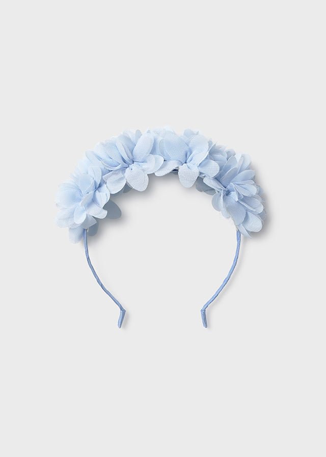 A beautiful Mayoral baby girl floral headband in soft sky blue, designed to add an elegant finishing touch to any baby outfit. This charming accessory features delicate layered chiffon flowers that create a light, airy look, perfect for special occasions, family photos, or everyday styling. Ideal for pairing with dresses and occasion wear for baby girls.