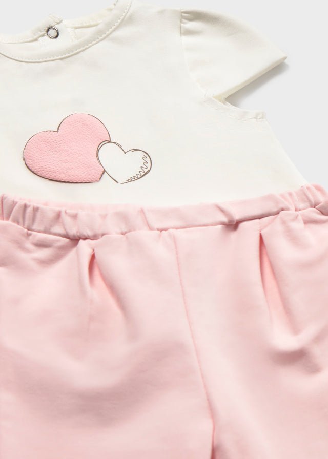 Sweet and comfortable Mayoral newborn girl three-piece tracksuit designed for everyday wear and cosy outings. This adorable set includes a short-sleeve t-shirt with heart motif, a soft printed zip sweatshirt featuring cute teddy and heart designs, and matching elasticated pink trousers. Made from soft stretch cotton fabrics, it offers gentle comfort and flexibility, perfect for newborn baby girls.