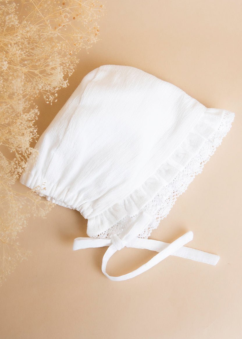 A classic newborn girl christening bonnet made from soft, breathable cotton with delicate lace trim. Designed to perfectly complement christening dresses and special occasion outfits while ensuring comfort for newborns.