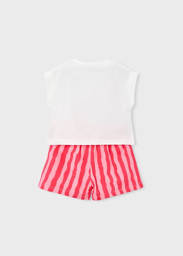 A fresh and summery girls’ short set by Mayoral, featuring a soft short-sleeve t-shirt paired with matching shorts. The white t-shirt is detailed with a colourful beach-inspired print, while the shorts stand out with a bold striped design. A comfortable and playful outfit, ideal for warm days, holidays, and everyday wear.
