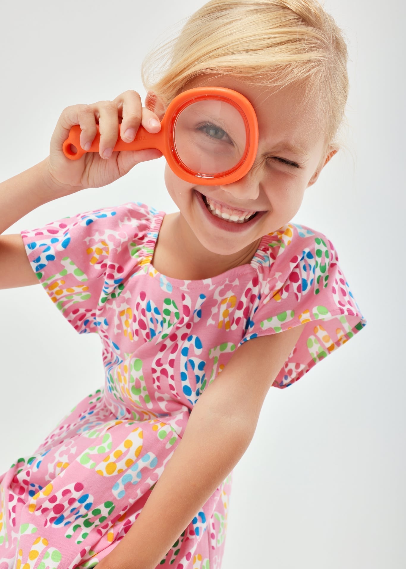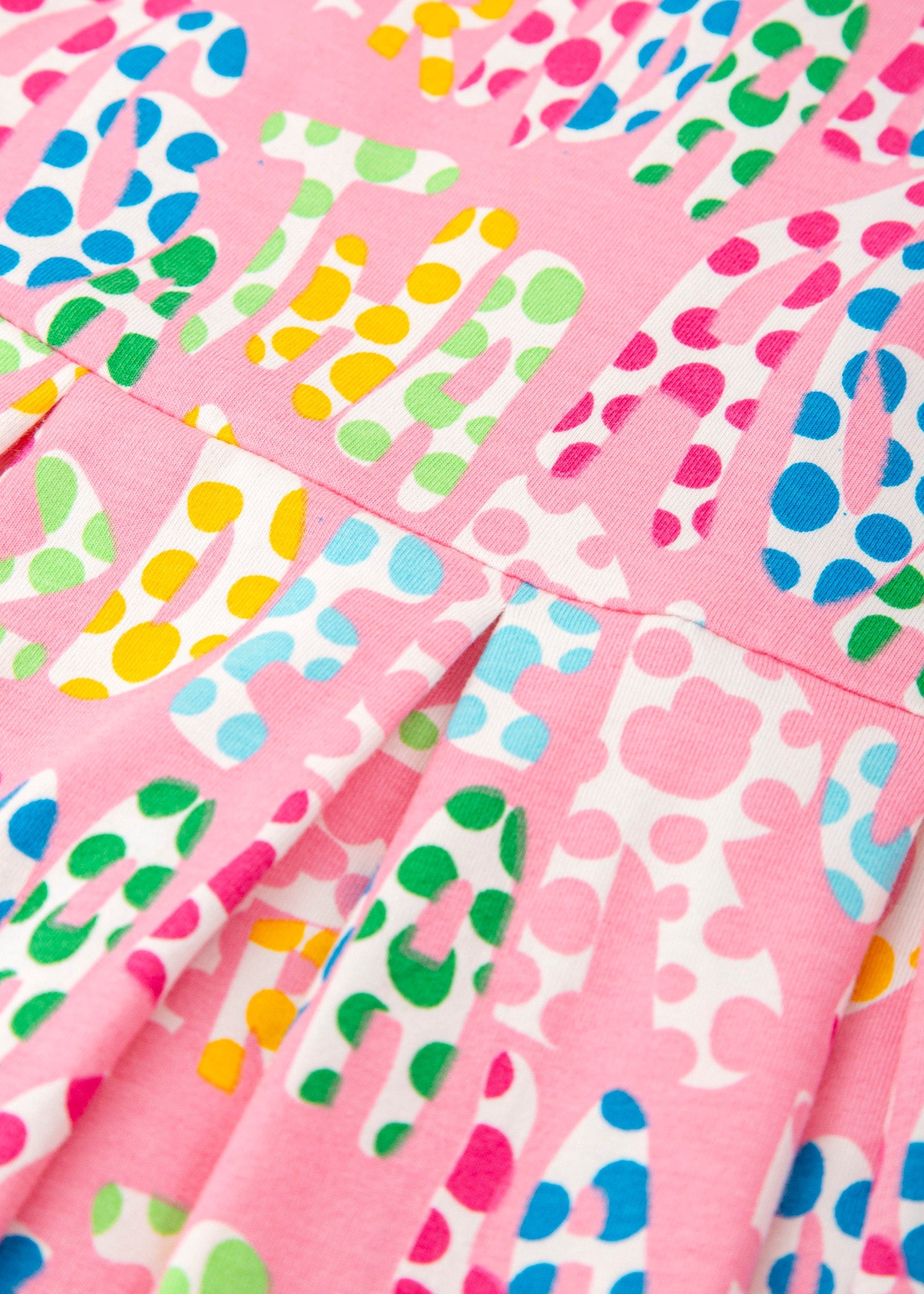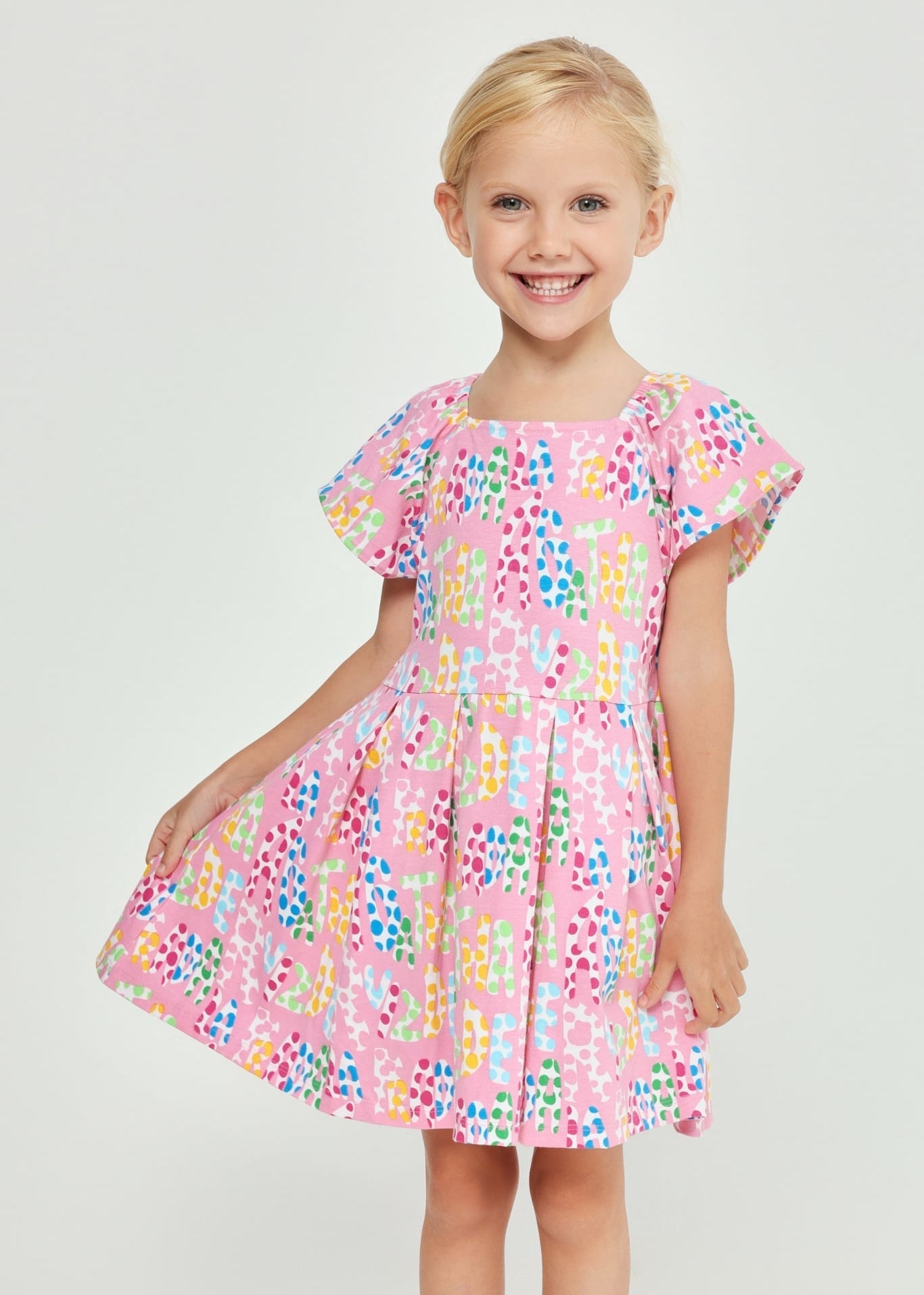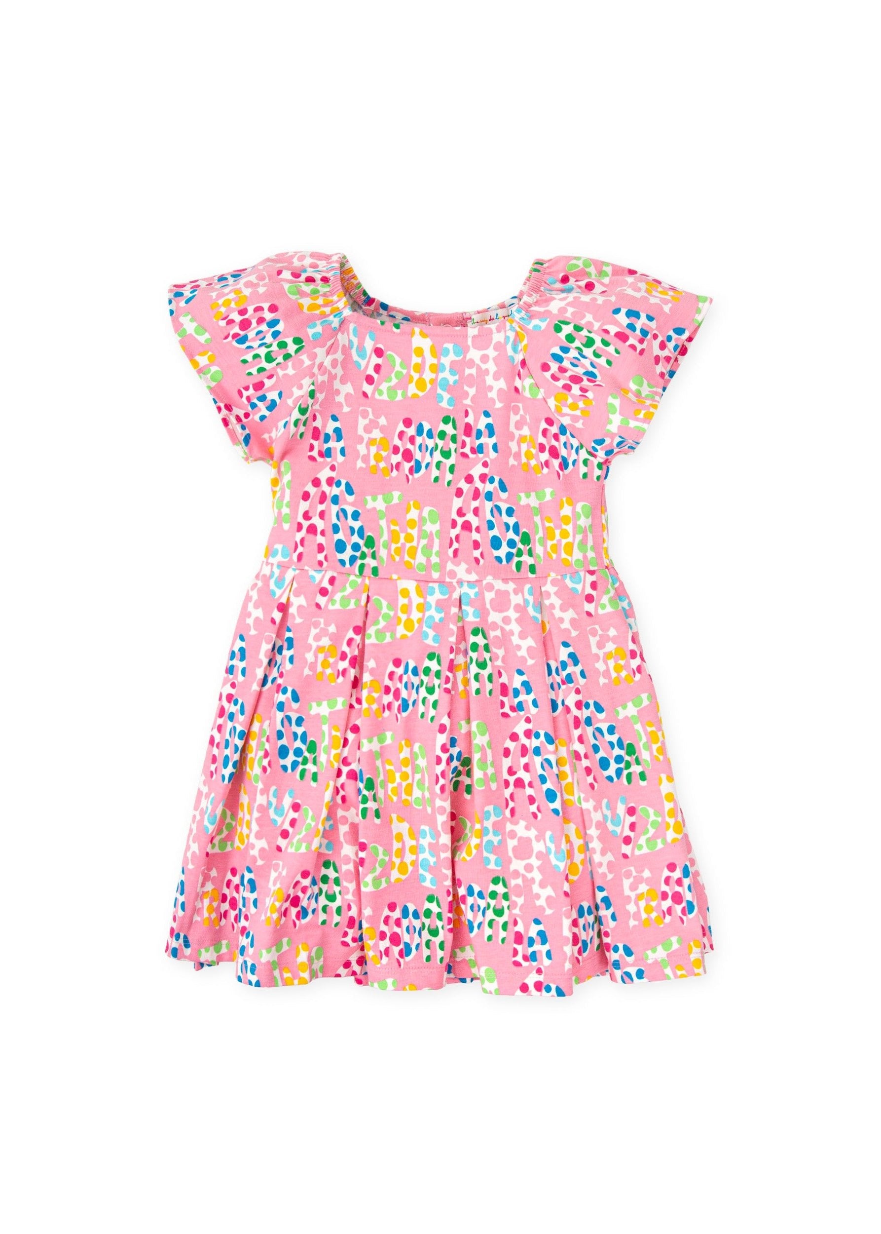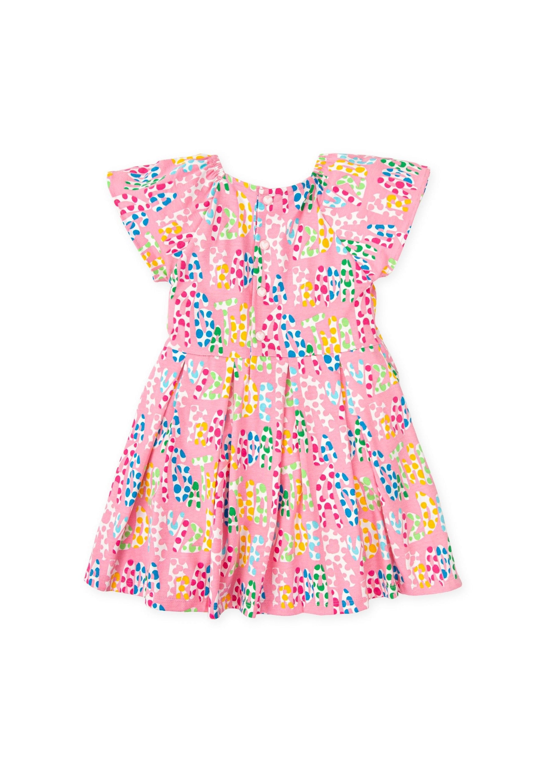 Colourful and playful Agatha Ruiz De La Prada girls dress featuring the brand’s signature multicolour logo print on a bright pink background. Designed with flutter sleeves and a softly gathered skirt, this cheerful dress is made from comfortable stretch cotton, perfect for everyday wear, holidays, and summer outings.