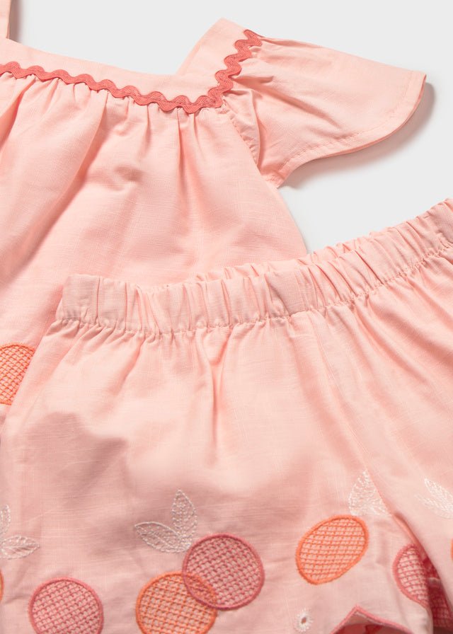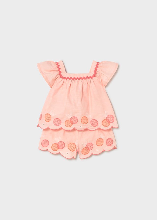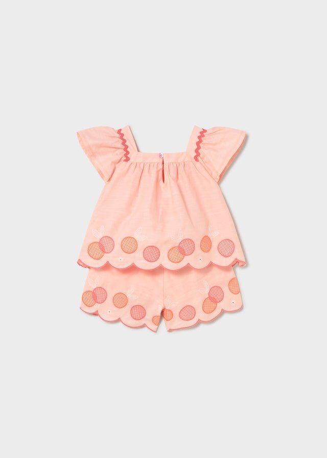 Mayoral baby girl two-piece summer set featuring a lightweight blouse with flutter sleeves and matching embroidered bermuda shorts. Designed in a soft peach tone with delicate fruit-inspired embroidery and scalloped edging, this adorable outfit is perfect for warm days, holidays, and special summer occasions.
