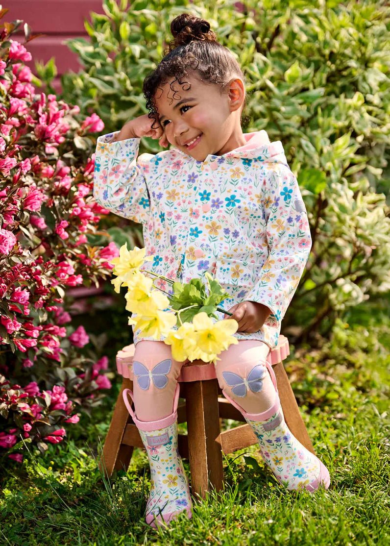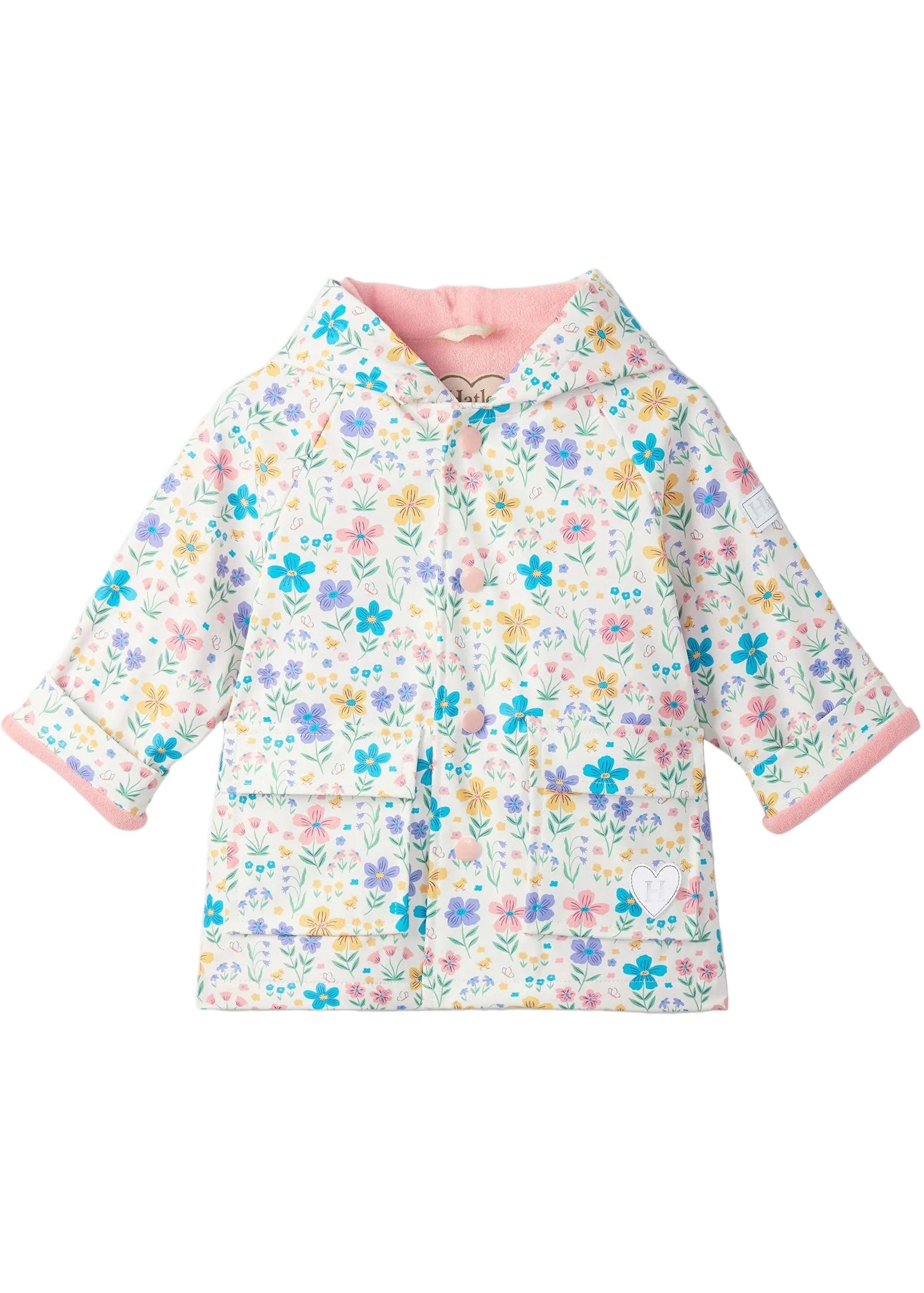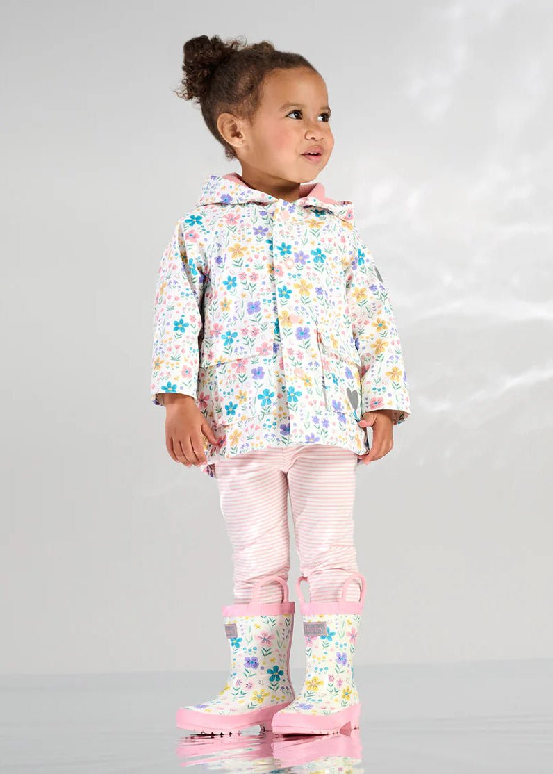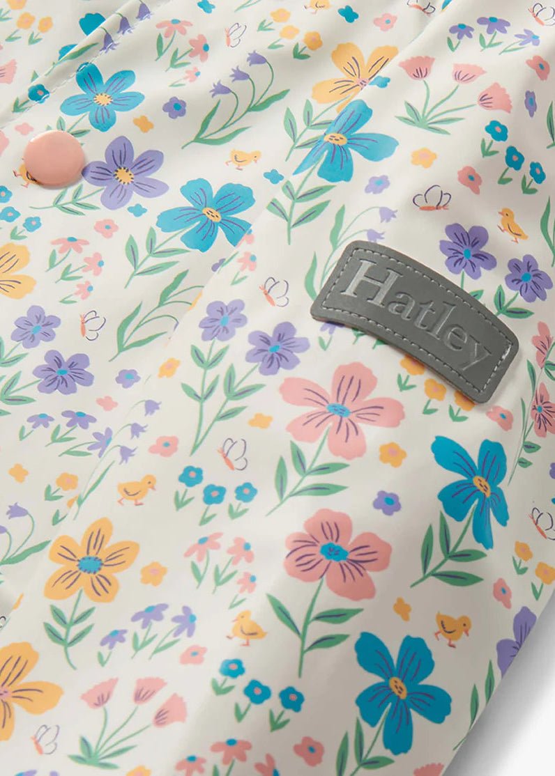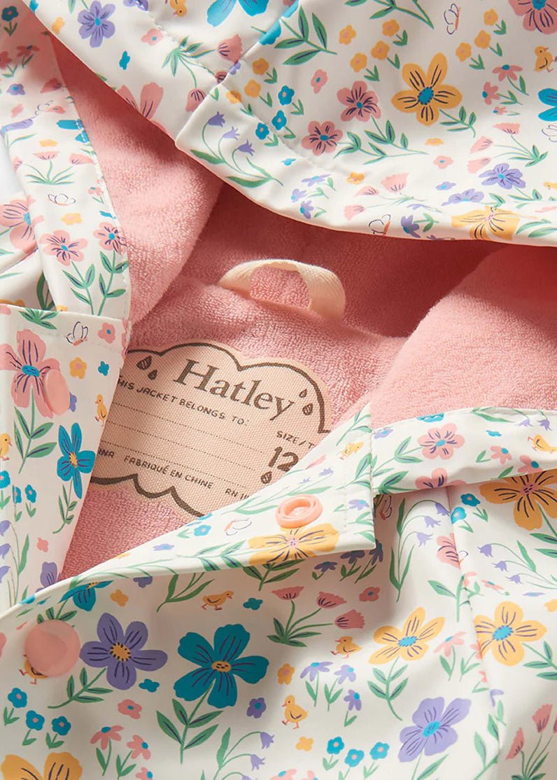 Adorable girls raincoat by Hatley featuring a charming little garden chicks and floral print, perfect for brightening rainy days. Designed with waterproof protection and a soft comfortable lining, this practical raincoat keeps little ones dry while ensuring cozy comfort. The easy snap-front closure allows quick dressing, making it ideal for everyday outings, nursery days, and spring showers.