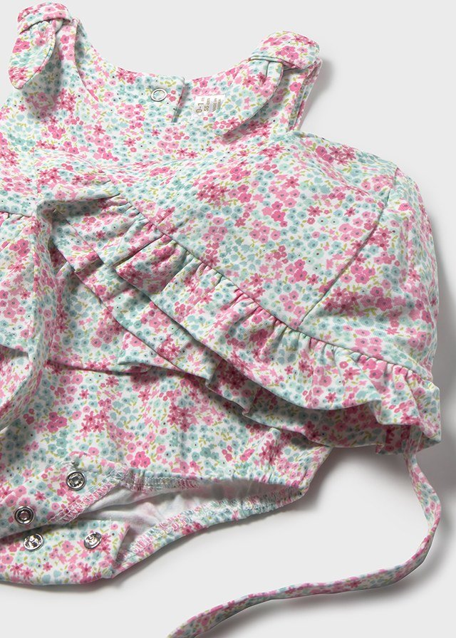 Mayoral newborn girl floral onesie set designed for comfort and sweet summer styling. Featuring an all-over delicate floral print with soft frill detailing, this adorable knit onesie comes with a matching sun hat for a complete coordinated look. Perfect for warm days, outings, or special occasions.
