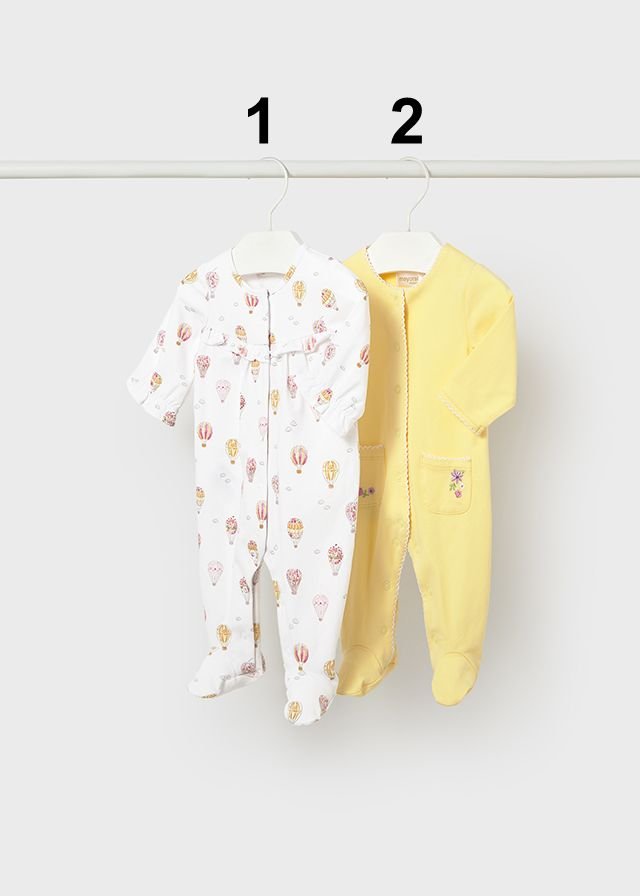 Sweet and cosy Mayoral newborn girl babygrow pyjamas designed for comfort and gentle everyday wear. Available in two styles shown in images 1 and 2, each babygrow is sold separately. One features a delicate hot air balloon print with frill detailing for a charming look, while the other comes in soft yellow with embroidered pocket details and classic styling. Made from soft stretch cotton, these babygrows provide comfort and flexibility for delicate newborn skin.