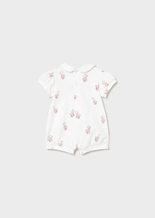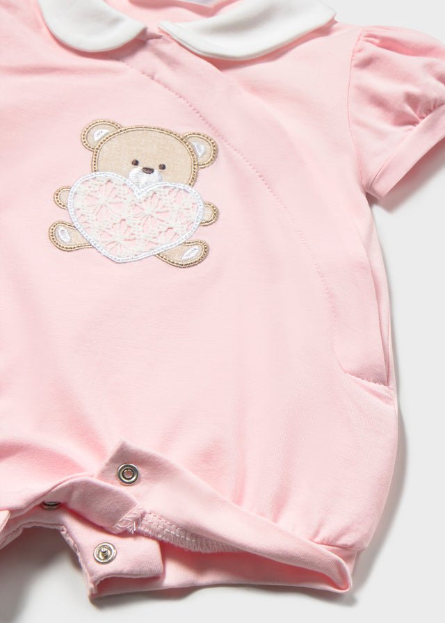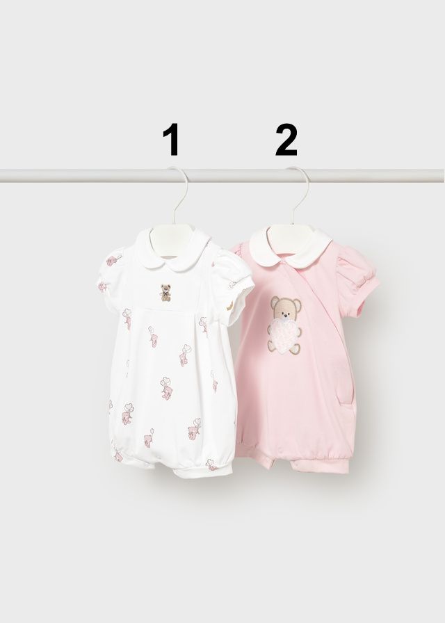 Adorable Mayoral newborn girl short romper designed for comfort and sweet everyday styling. Available in two styles shown in images 1 and 2, each romper is sold separately. One features an all-over teddy print on a soft white base with a classic collar, while the other showcases a delicate pink design with a charming teddy bear appliqué holding a heart. Crafted from soft stretch cotton blends, these rompers provide gentle comfort for delicate newborn skin.