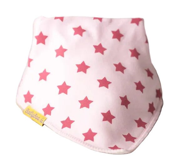 Cute DribbleBoo bandana bib with berry star print on soft pink background. Designed to keep baby dry while adding a stylish everyday look. Ideal for dribbling and teething babies.