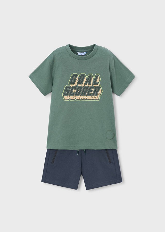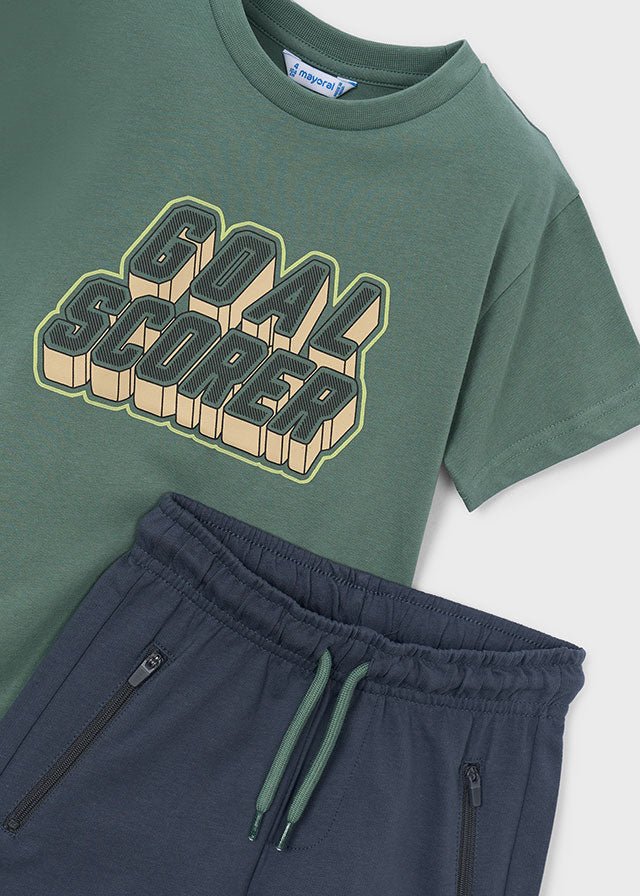Sporty Mayoral boys two-piece summer set featuring a green cotton short sleeve t-shirt with bold “Goal Scorer” graphic and matching navy bermuda shorts. Designed for everyday comfort and active wear, this soft cotton outfit is perfect for casual outings, holidays, or playtime while keeping a stylish sporty look.