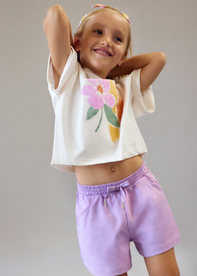 A soft and stylish girls’ short sleeve t-shirt featuring a delicate floral print in soft pastel tones. Designed with a relaxed fit and finished with a matching fabric headband, this piece is perfect for everyday summer outfits and casual occasions.
