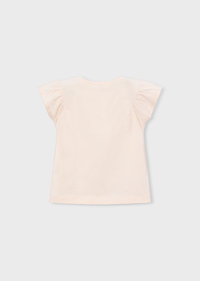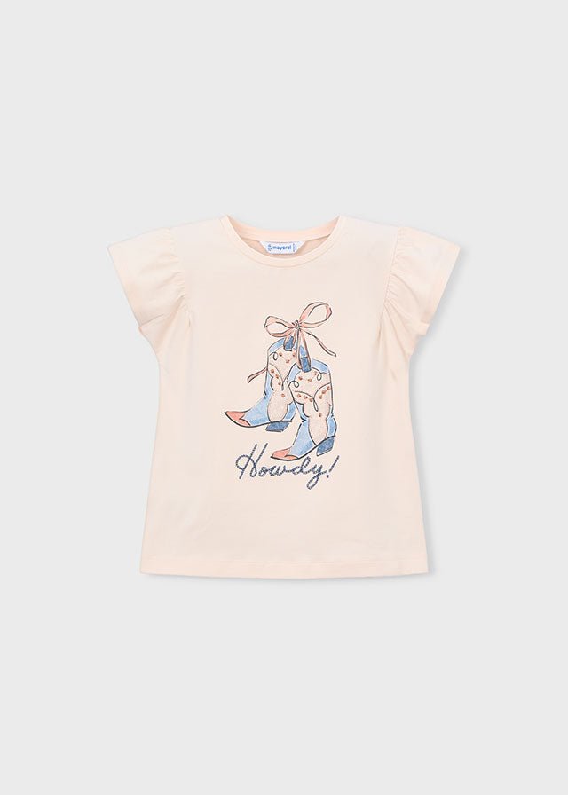 A charming girls short sleeve t-shirt featuring a delicate ballet shoes print with a tied bow detail. Designed with soft puff sleeves and a comfortable stretch fit, this t-shirt is perfect for everyday wear while adding a sweet, girly touch. Made by Mayoral, it pairs beautifully with jeans, shorts, or skirts for a stylish casual look.