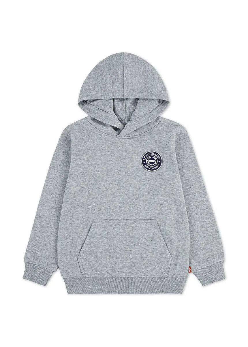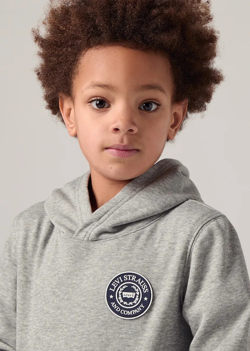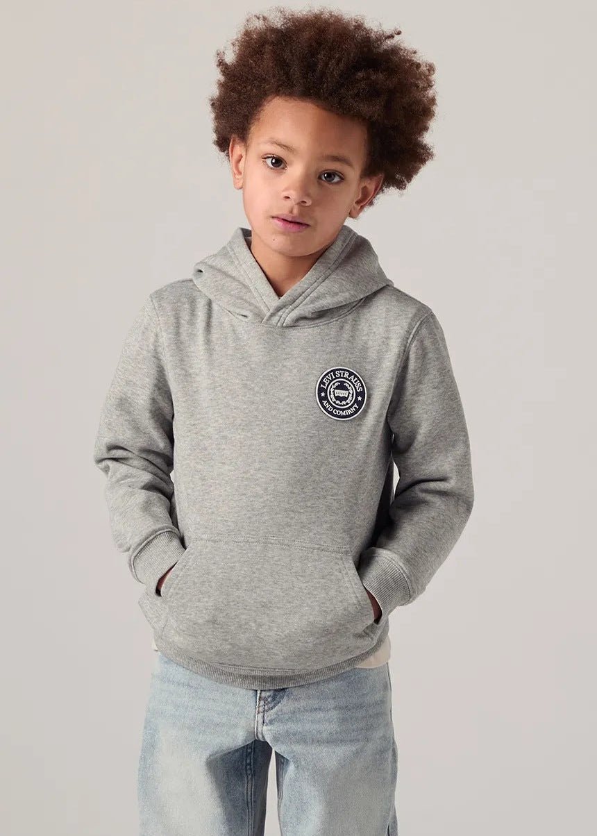 Levi’s boy hooded sweatshirt featuring a modern crest logo design with signature Levi Strauss branding. Designed in a classic grey marl tone, this comfortable everyday hoodie combines sporty style with practical warmth. Perfect for casual outfits, school wear, and layering during cooler days.