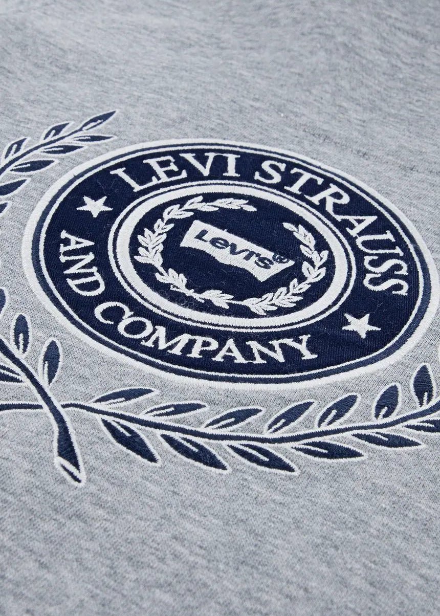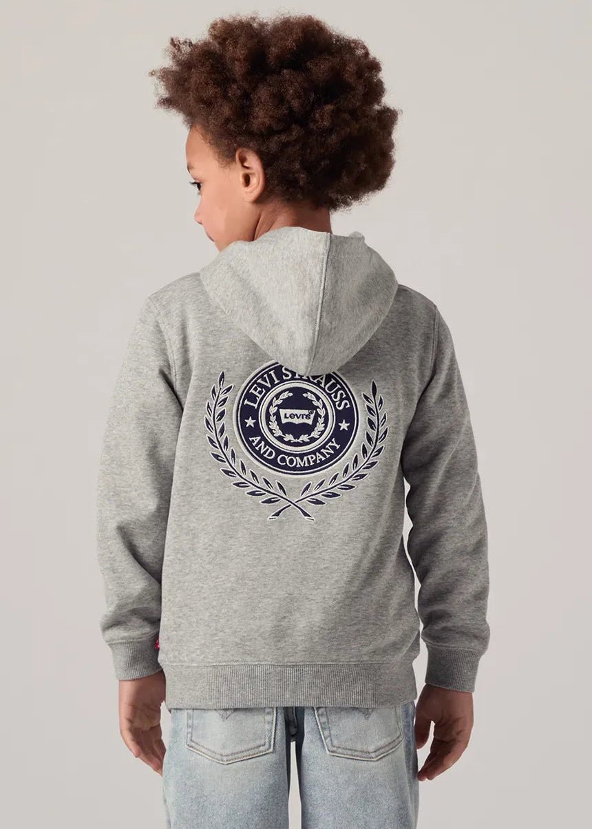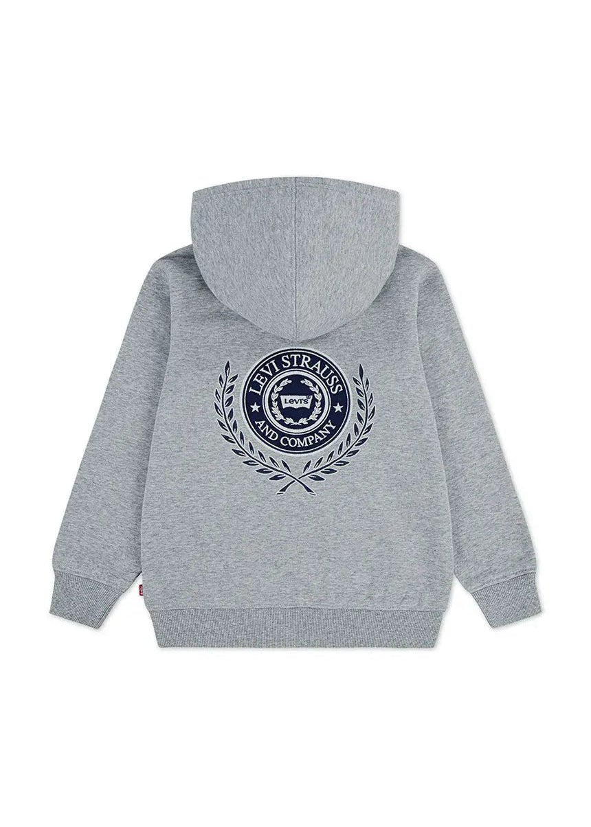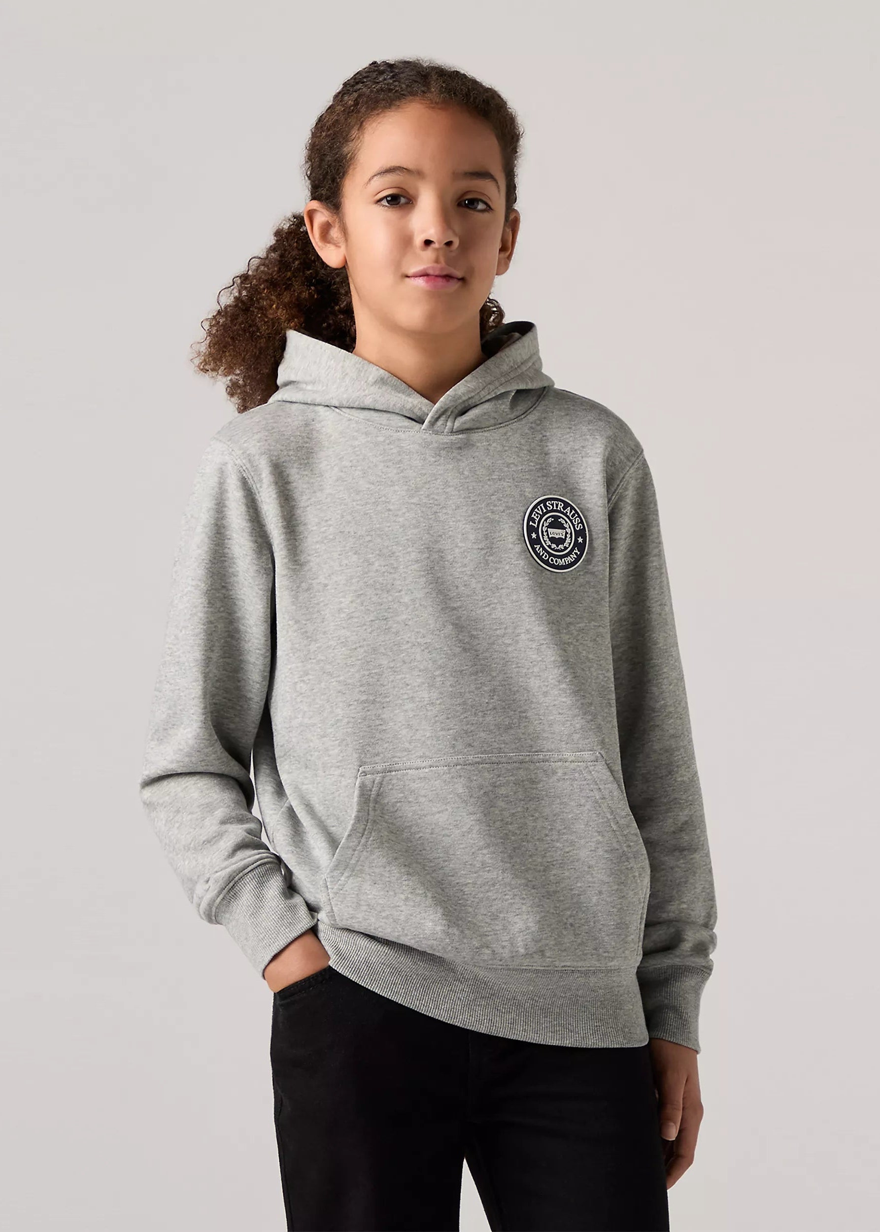 Levi’s boy hooded sweatshirt featuring a modern crest logo design with signature Levi Strauss branding. Designed in a classic grey marl tone, this comfortable everyday hoodie combines sporty style with practical warmth. Perfect for casual outfits, school wear, and layering during cooler days.