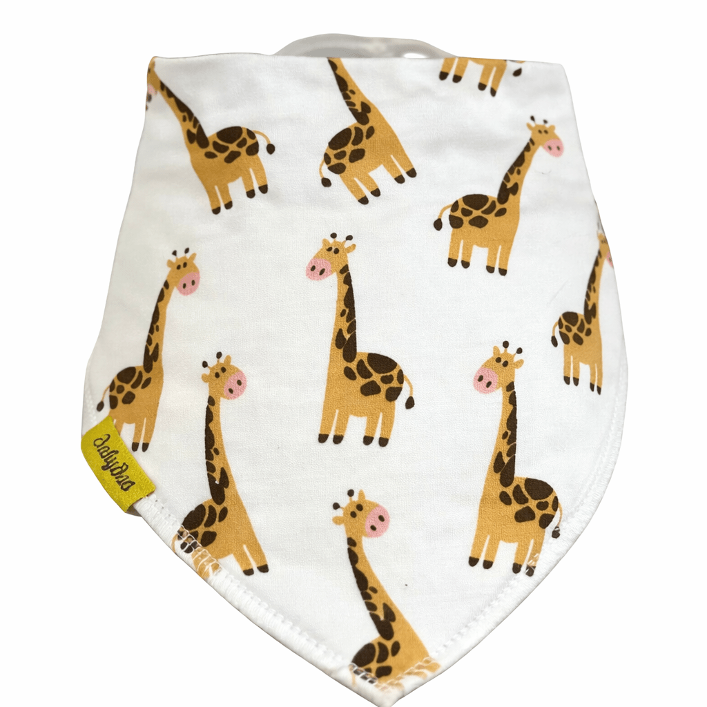 Cute DribbleBoo bandana bib featuring a playful Gerry giraffe print. Designed to keep baby dry while adding a fun everyday style. Ideal for dribbling and teething babies.
