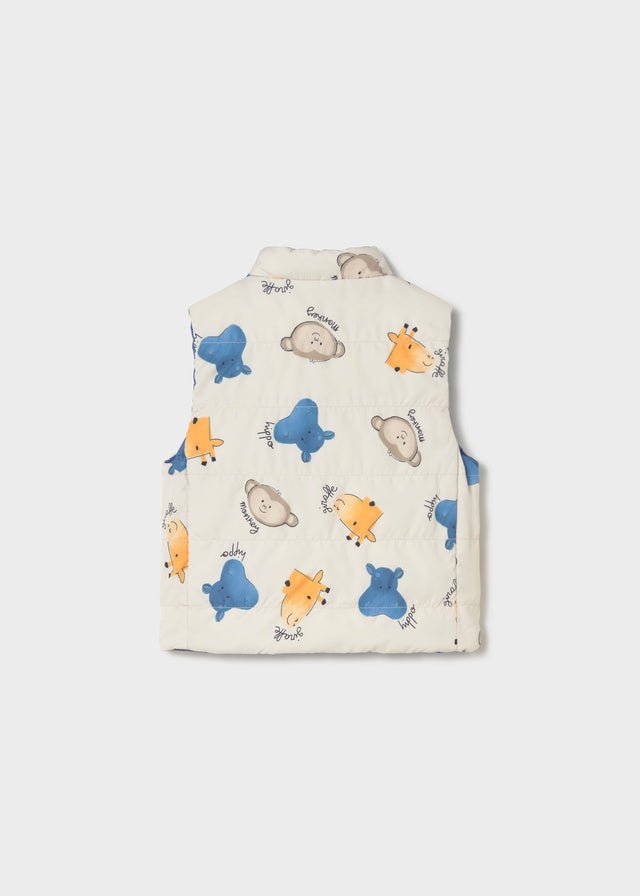 Practical and versatile baby boy reversible padded vest by Mayoral, designed to offer two looks in one. One side features a smooth blue finish, while the reverse showcases a playful animal print, adding a fun touch to everyday outfits. Lightweight yet warm, this vest is perfect for layering during cooler days.