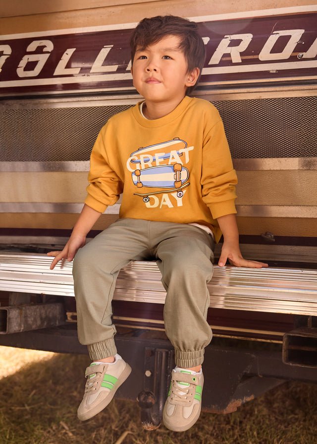 A comfortable and stylish boys’ tracksuit by Mayoral, featuring a soft sweatshirt with a playful skateboard print and matching jogger trousers. Designed for everyday wear, this set offers a relaxed fit that’s perfect for playtime, outings, or casual days.