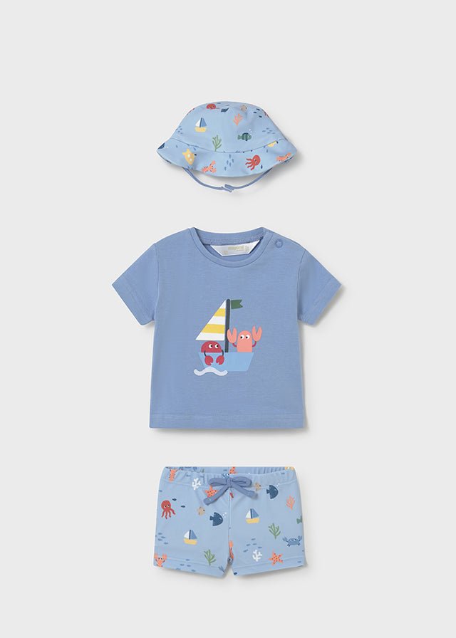 This newborn boy bathing suit set includes a short-sleeve t-shirt, swim shorts, and a matching sun hat, designed for comfort and style during warm-weather outings. The soft cotton t-shirt features a playful sea-themed print, while the lightweight swim shorts and hat are ideal for pool or beach days. A practical and adorable summer set for newborn boys.