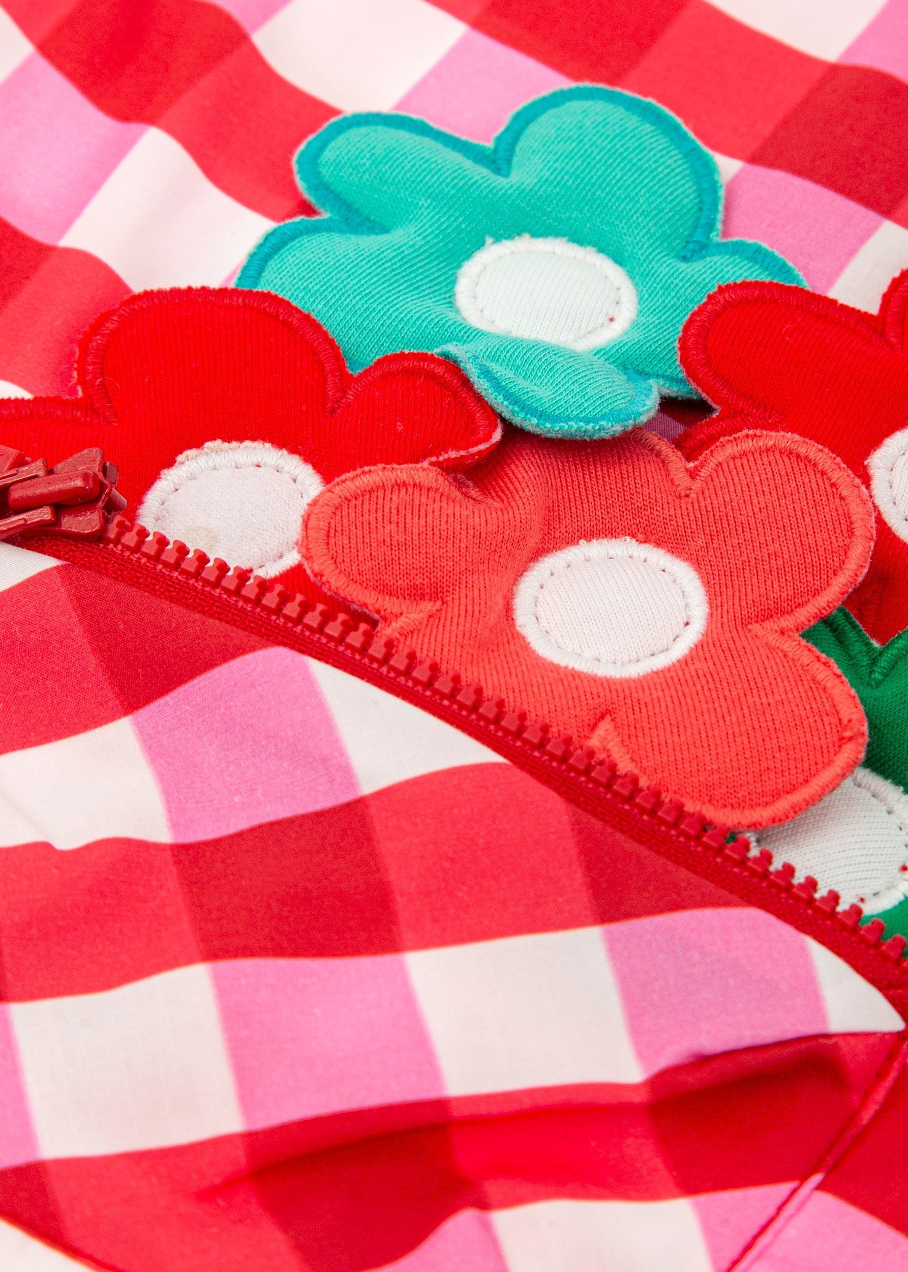 • Front patch pocket with floral appliqués