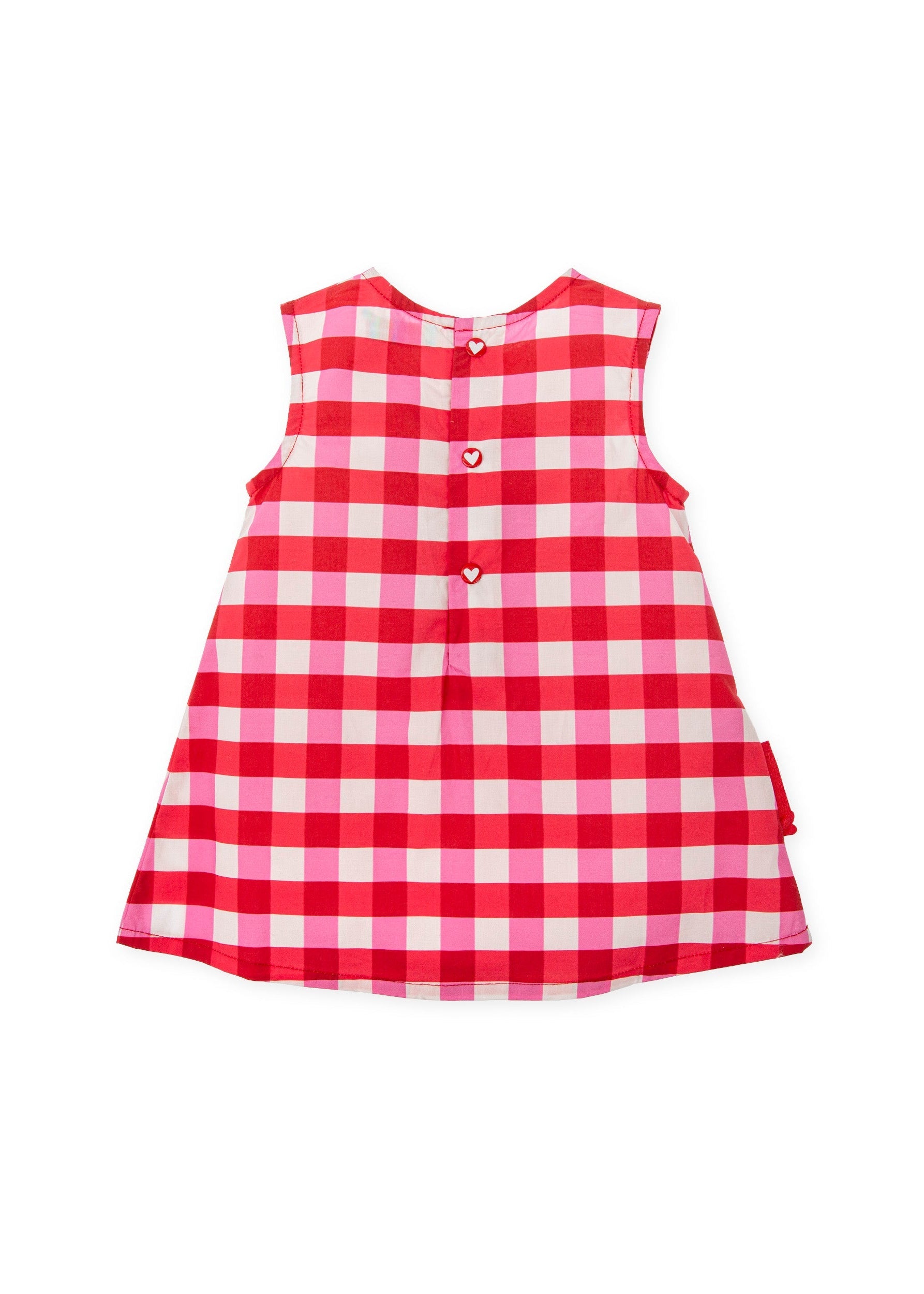 Bright and playful girls dress by Agatha Ruiz de la Prada, designed in a vibrant pink, red and white check pattern. Made from soft cotton poplin, this sleeveless A-line dress is lightweight and comfortable for warmer days. The front features a fun patch pocket with colourful floral appliqués, adding a signature playful touch. Heart-shaped popper fastenings at the back complete the design with iconic brand detail.