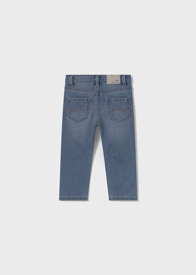 These baby boy denim trousers by Mayoral offer the classic jeans look with the comfort little ones need. Made from a soft stretch cotton blend, they feature a gently faded wash, an adjustable waistband, and a button fastening for a perfect fit. The denim fabric feels lightweight and flexible, allowing easy movement during playtime. Ideal for everyday wear, these jeans can be dressed up with a shirt or kept casual with a t-shirt.