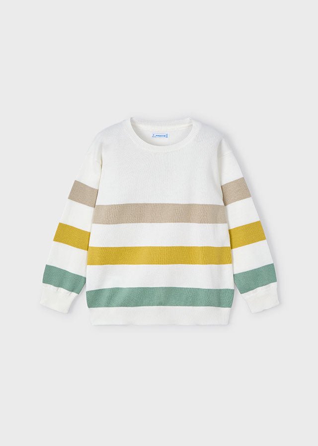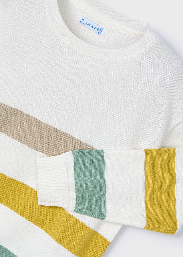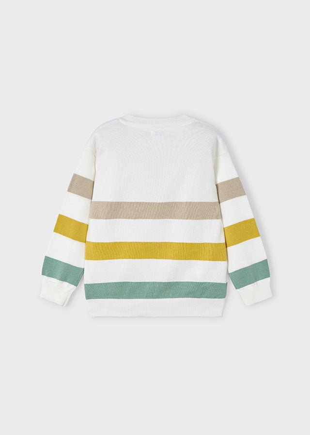 This boys’ knitted jumper by Mayoral is crafted from soft 100% cotton for everyday comfort. It features wide horizontal stripes in earthy tones of beige, mustard, and green on a clean white base. The crew neckline, ribbed cuffs, and hem provide a snug fit, making it perfect for layering on cooler days. A stylish yet versatile piece for casual and smart occasions alike.