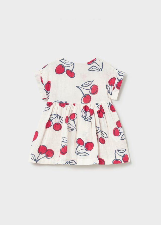 Mayoral baby girl cotton dress with an all-over cherry print. Designed with short sleeves, a softly gathered skirt, and front button fastening for easy dressing and everyday comfort during warmer days.