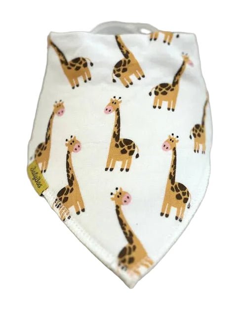 Cute DribbleBoo bandana bib featuring a playful Gerry giraffe print. Designed to keep baby dry while adding a fun everyday style. Ideal for dribbling and teething babies.
