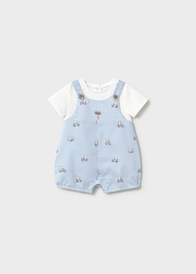 Adorable Mayoral newborn boy one-piece dungaree romper featuring a soft integrated short sleeve top with a striped dungaree-style design decorated with a playful teddy bear print. Designed for comfort and practicality, this charming romper includes buttoned shoulder straps, elasticated leg openings, and breathable cotton fabric, making it ideal for everyday wear, gifting, or special occasions.