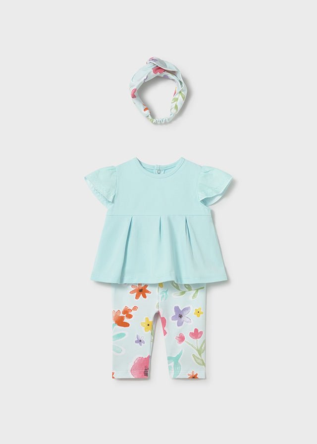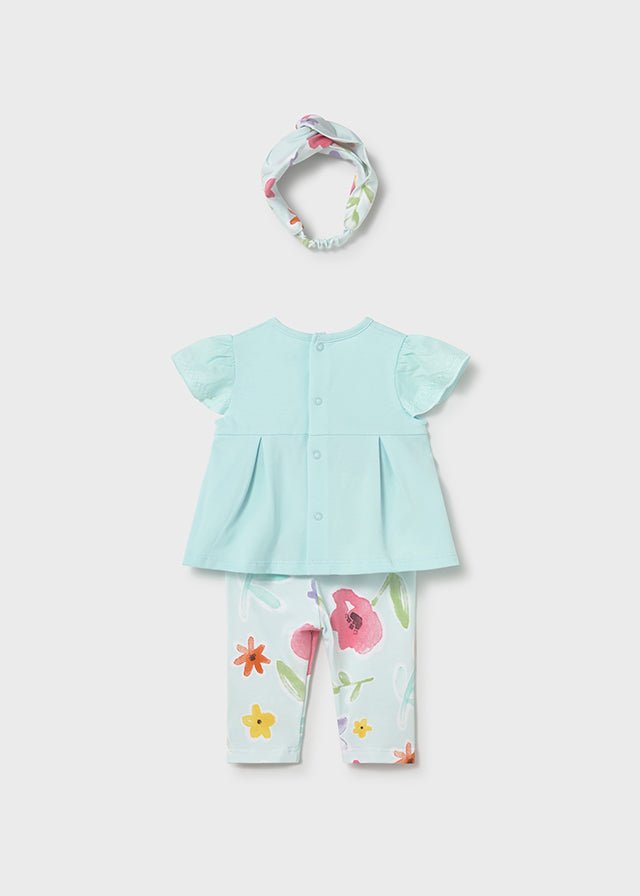 A soft and charming newborn girl leggings set by Mayoral, designed for comfort and everyday wear. The short sleeve t-shirt features a gently flared shape with delicate lace trim on the sleeves and a back popper fastening for easy dressing. Paired with floral print leggings and a matching headband, this coordinated set is perfect for warm days and special moments.