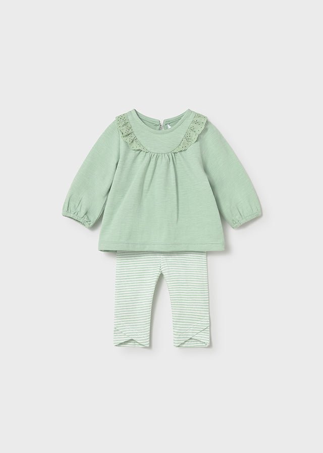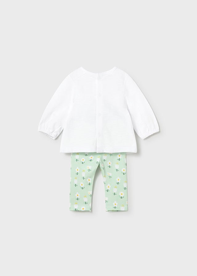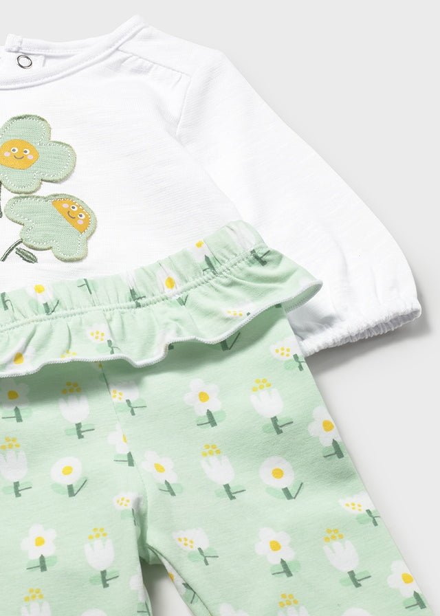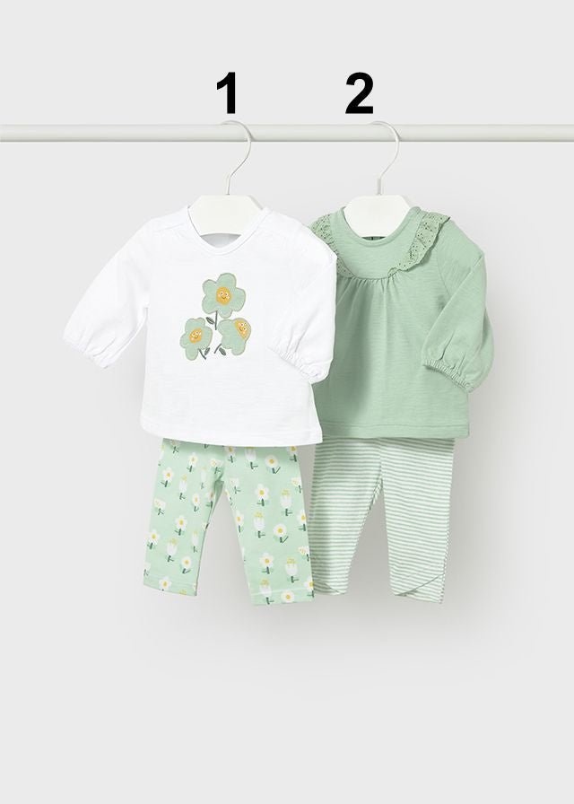 A beautifully soft newborn girl two-piece outfit by Mayoral, designed for comfort and everyday wear. Each set includes a long sleeve cotton t-shirt with gentle gathered detailing and a cute floral motif or delicate lace collar, paired with matching leggings finished with a soft elasticated waistband. The breathable cotton fabric ensures comfort throughout the day, making this outfit ideal for playtime, outings, or cosy days at home.