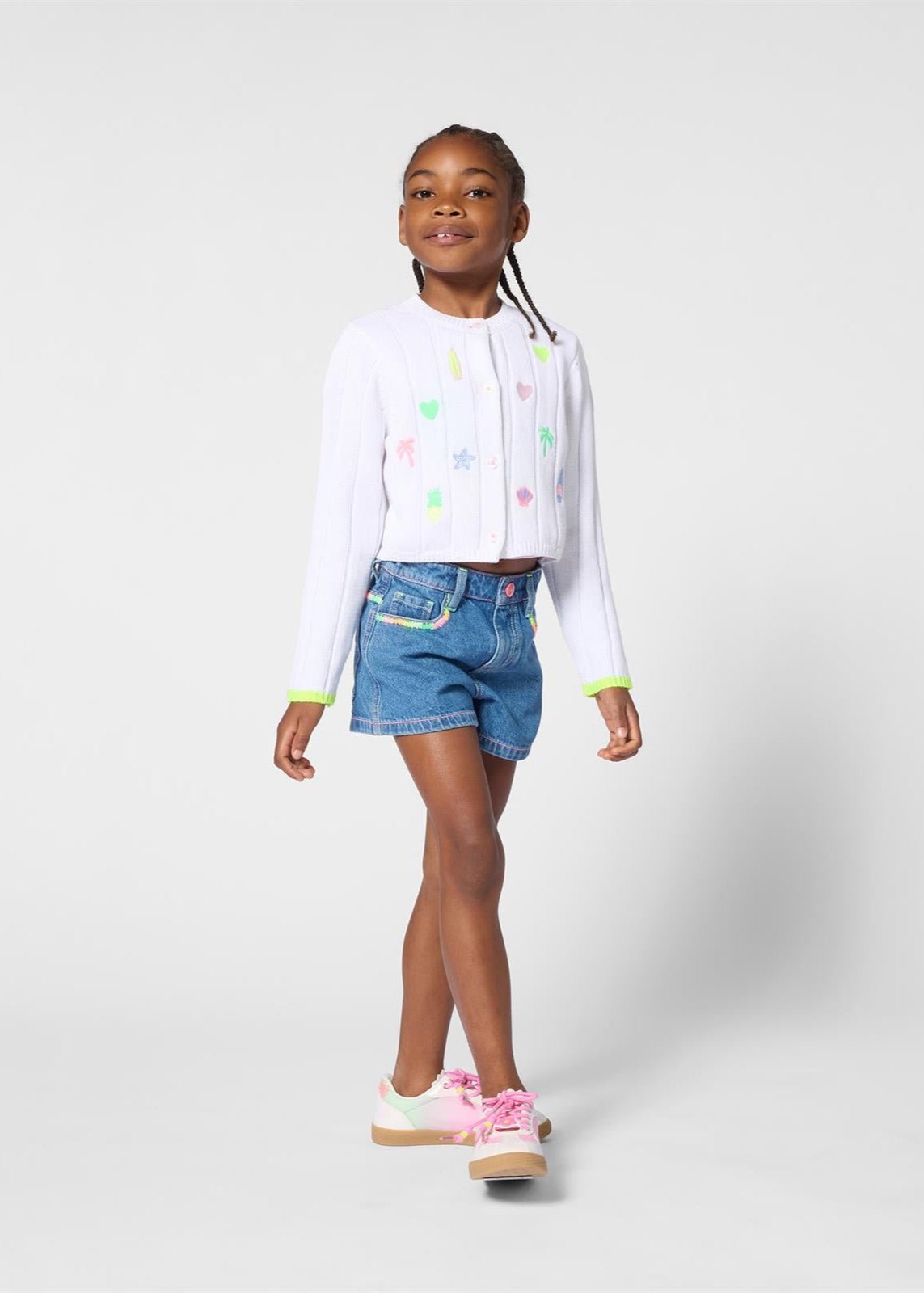 These Billieblush girls’ denim shorts are a fun twist on a classic style. Made from soft cotton denim, they feature colourful rainbow embroidery along the pockets and back for a playful finish. Designed with a glittery pink snap button and an adjustable waistband, they combine comfort and sparkle — perfect for summer adventures.